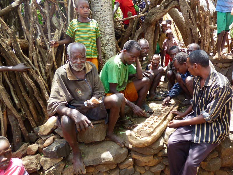 Schon beim Nähern sahen wir die typischen terrassenförmigen Felder. Im Dorf angekommen, erfuhren wir Interessantes über die Lebensweise der Konso. Auf dem Versammlungsplatz standen hölzerne Stelen, die meist an berühmte Krieger erinnern sollen.