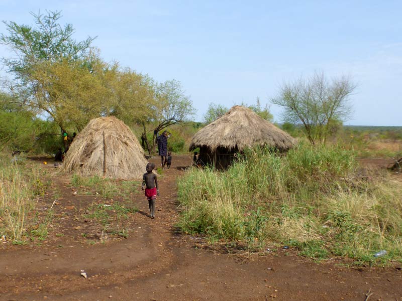 Nach 40 Minuten Fahrt über sandige enge Pisten erreichten wir dann ein Dorf der Mursi. Hier erfuhren wir, dass die Mursi als Nomaden Bauern und Rinderzüchter sind. Sie bauen Sorghum (eine Hirseart), Mais und Hülsenfrüchte an.