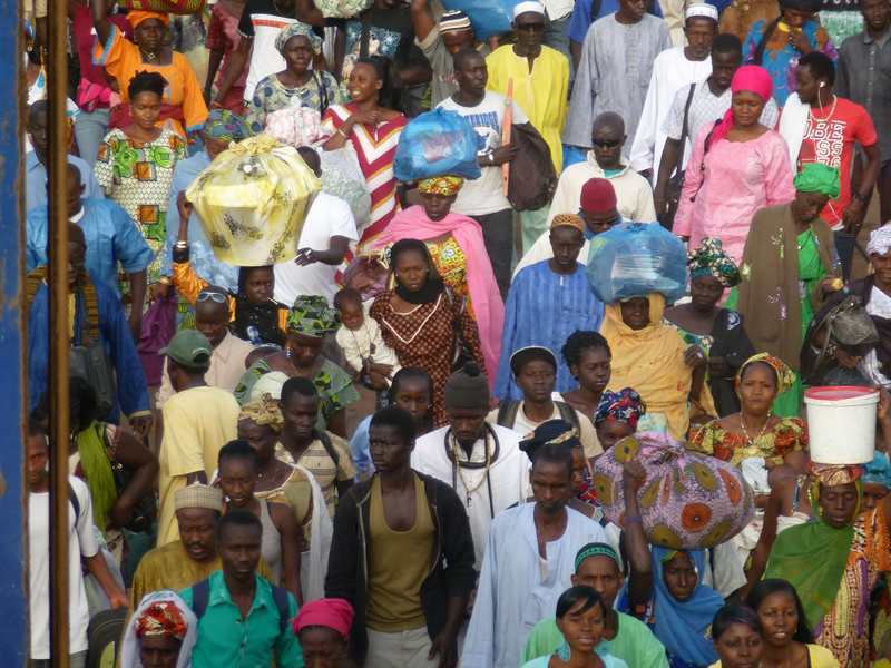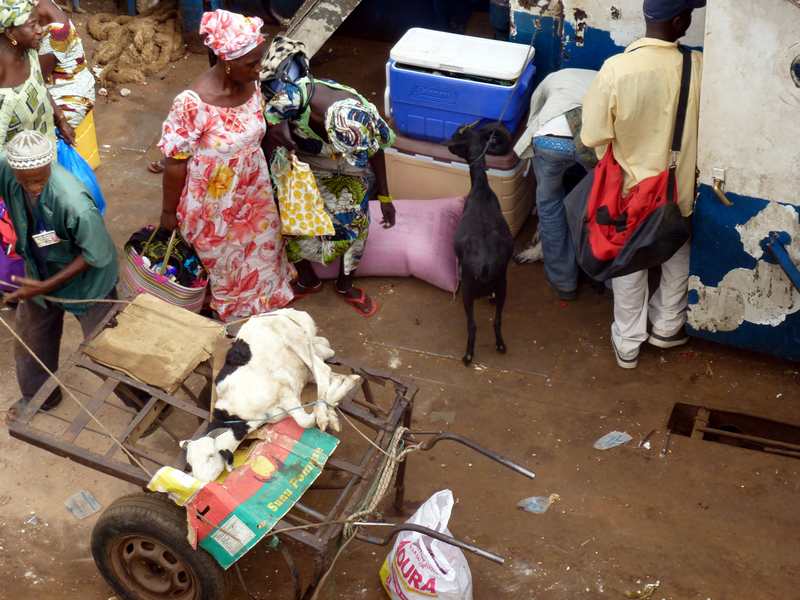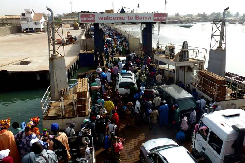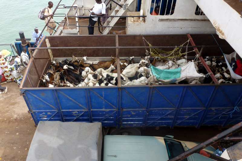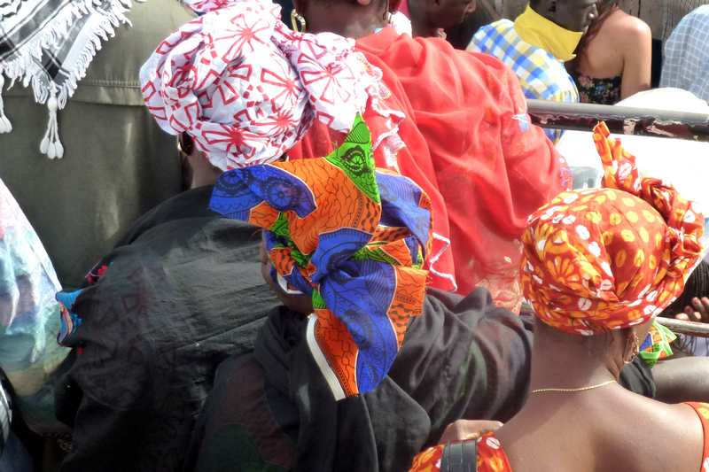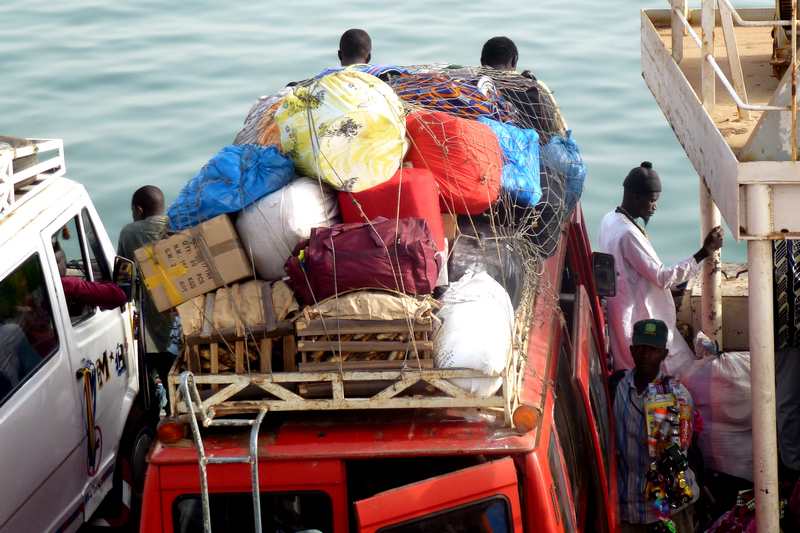 Am 18. März wurden wir am Morgen im Hotel abgeholt und zur Fährstation nach Banjul gebracht. Dort führten uns die Guides auf die Fähre, wo wir uns auf dem Oberdeck eine Bank suchten. Nach den Touristen wurde der Eingang für die Einheimischen geöffnet und wir konnten das bunte Treiben von oben wunderbar beobachten. Die bunte Kleidung der Frauen und das Frachtgut mancher Leute waren besonders beeindruckend.