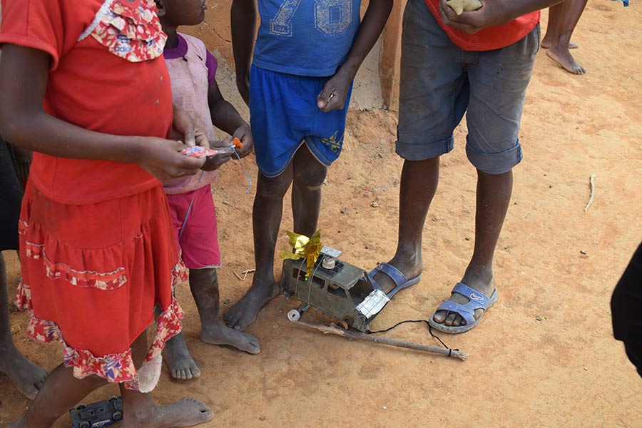 Kurz vor dem Ziel machten wir Halt im Dorf Vohidsaoka, um wieder einige Kinder zu beglücken, Hier gab es sogar ein kleines Karussell und ein Junge zeigte uns stolz sein aus Blechbüchsen und Flaschenverschlüssen gebasteltes Spielzeugauto. Das natürliche Lachen der Kinder war immer wieder ein schönes Erlebnis, zeigten sie doch über das kleinste Geschenk eine Freude und Dankbarkeit.