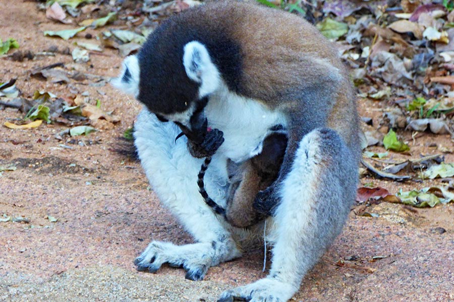 Beim Streifzug durch das vor einer imposanten Felswand gelegene Camp begegneten wir einer Gruppe Kattas (wie es sich in einem Camp dieses Namens gehört).