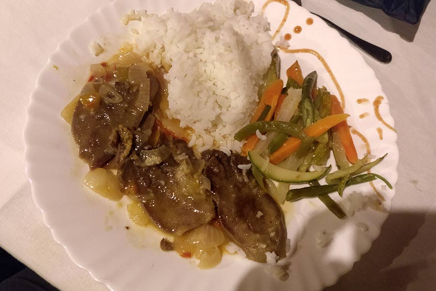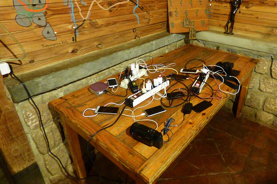 19 Uhr erwartete uns das Dinner im Restaurant, wo es auch die einzige Möglichkeit gab, auf einem Tisch die Akkus aufzuladen. Die Zebuzunge, der Pudding und der Grog aus einheimischem Rum waren vorzüglich. Daran konnte auch das große Insekt auf dem Tisch nichts ändern.