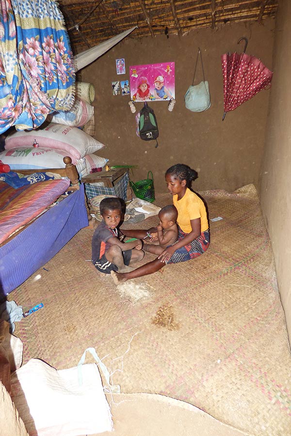 Wir drei schauten uns etwas im Dorf um und konnten auch in die Häuser schauen, die meist aus einem „Wohnraum“ mit einem Bett und einer völlig verrauchten Küche ohne Abzug bestanden. Schornsteine sahen wir in der ländlichen Gegend Madagaskars kaum. Die Eltern schlafen abends im Wohnraum und die Kinder in der Küche.