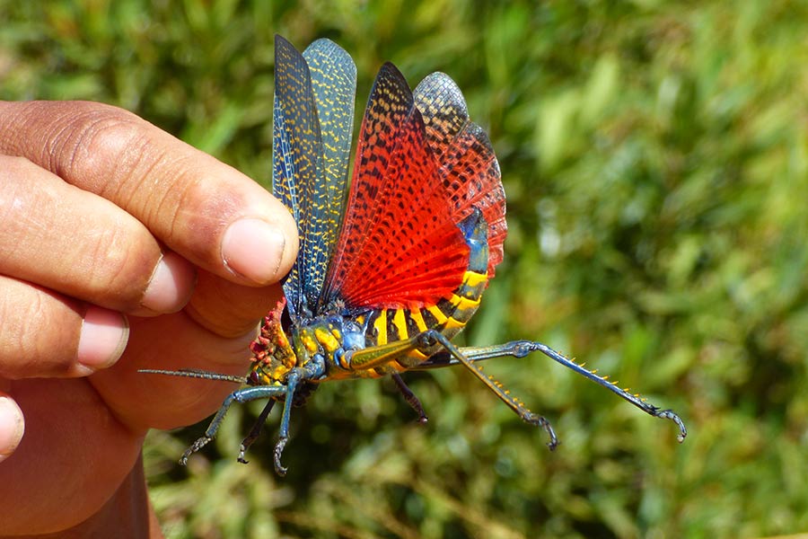 Wir machten wieder Halt im Dorf. Dort waren die Leute bei ihrer alltäglichen Arbeit. Auch eine bunte Heuschrecke erregte wieder unsere Aufmerksamkeit. Der armen Landbevölkerung dienen diese Insekten auch als Nahrungsmittel, ein zu großer Befall führt allerdings zu Ernteausfällen.