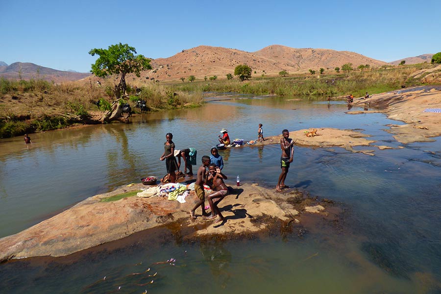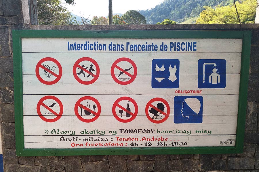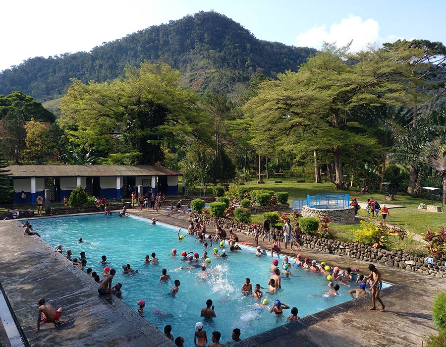 15 Uhr fuhr uns der Bus in die unweit gelegene Therme, die 5.000 Ariary Eintritt kostete. Über eine neue Hängebrücke erreicht man den Eingang. Dort standen drei sehr schöne Palmen und im Becken tummelten sich eine Menge einheimischer Kinder und Jugendliche.