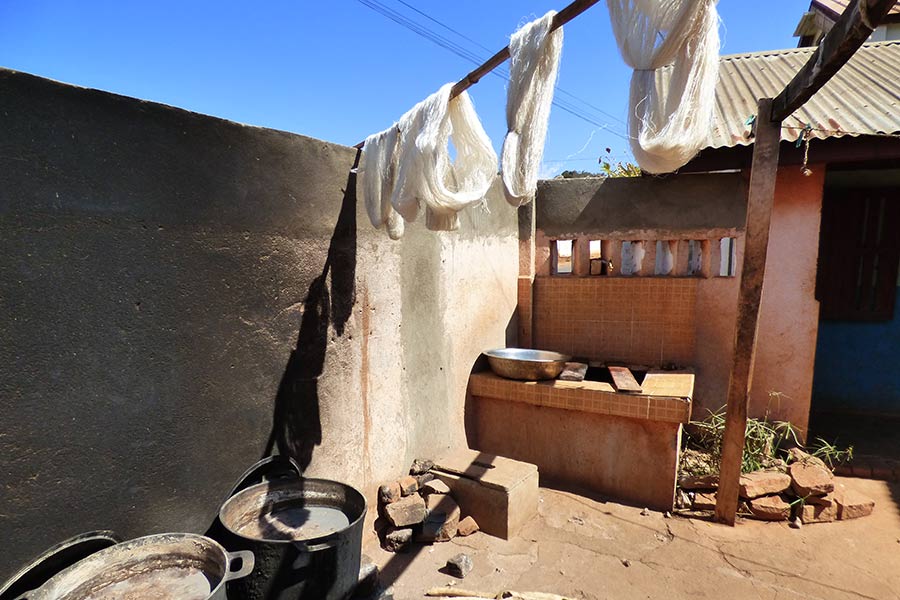 Im Anschluss besuchten wir die Seidenkooperative, wo sich Frauen des Ortes zusammengeschlossen haben, um aus den Kokons der Seidenraupen auf sehr primitive Art und Weise Seide herzustellen.