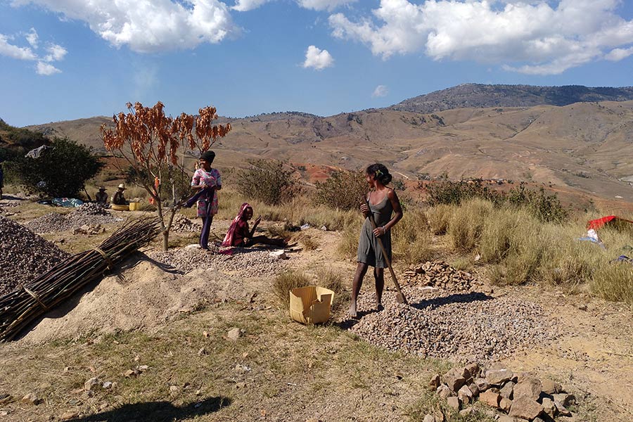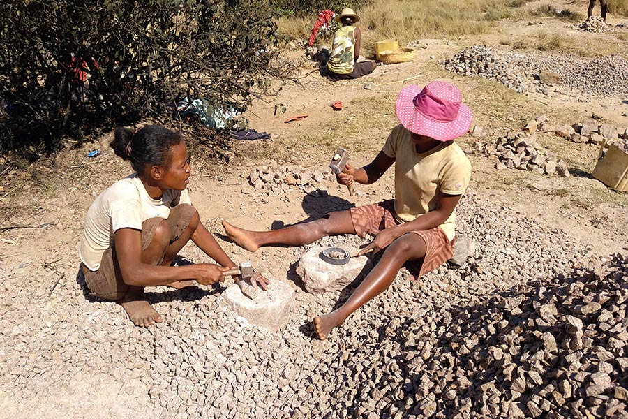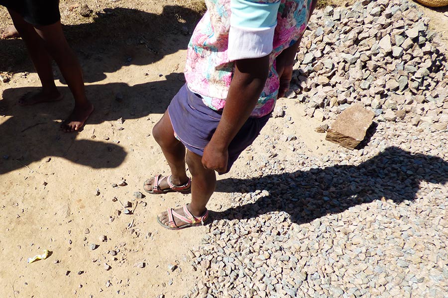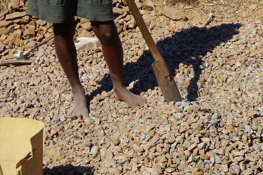 Nach 20 Minuten sahen wir am Straßenrand eine Gruppe Frauen, die als Steinklopfer große Granitblöcke zu Schotter zertrümmerten. Wir waren ziemlich schockiert über diese grobe Arbeit und dass die Mädchen mit nackten Füßen in dem scharfkantigen Kies stehen. Brigitte meinte, dass man damit gutes Geld verdienen kann.