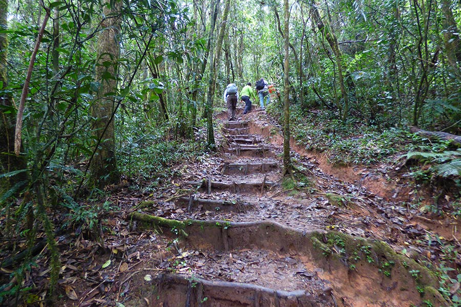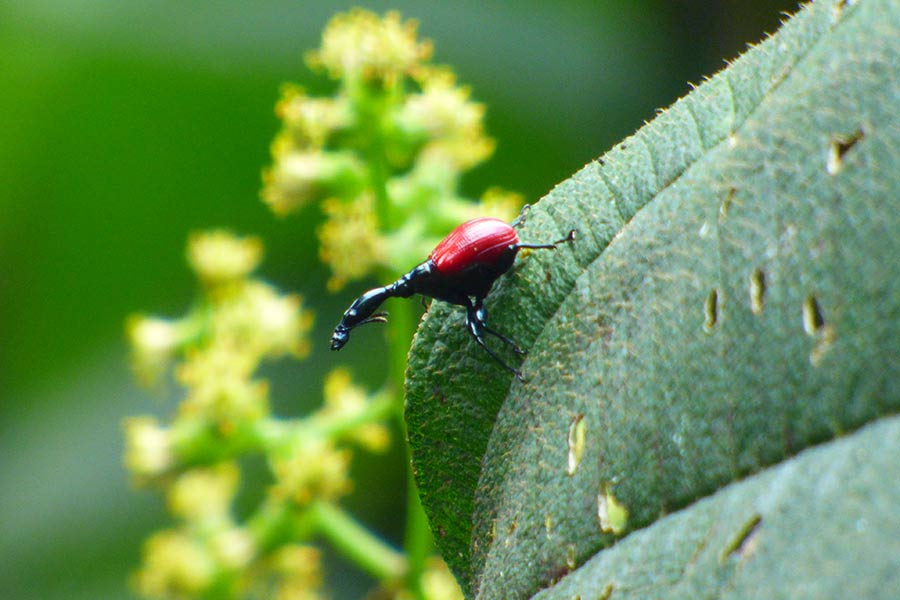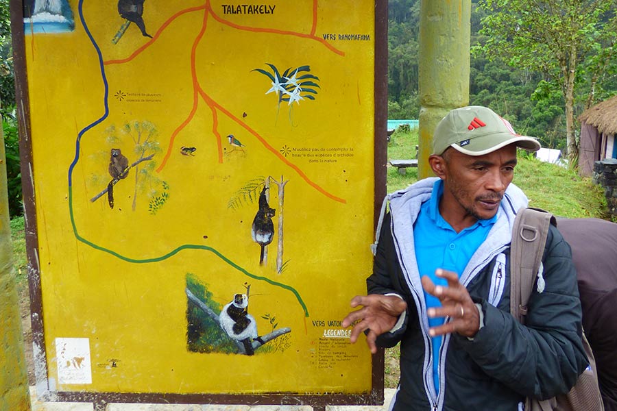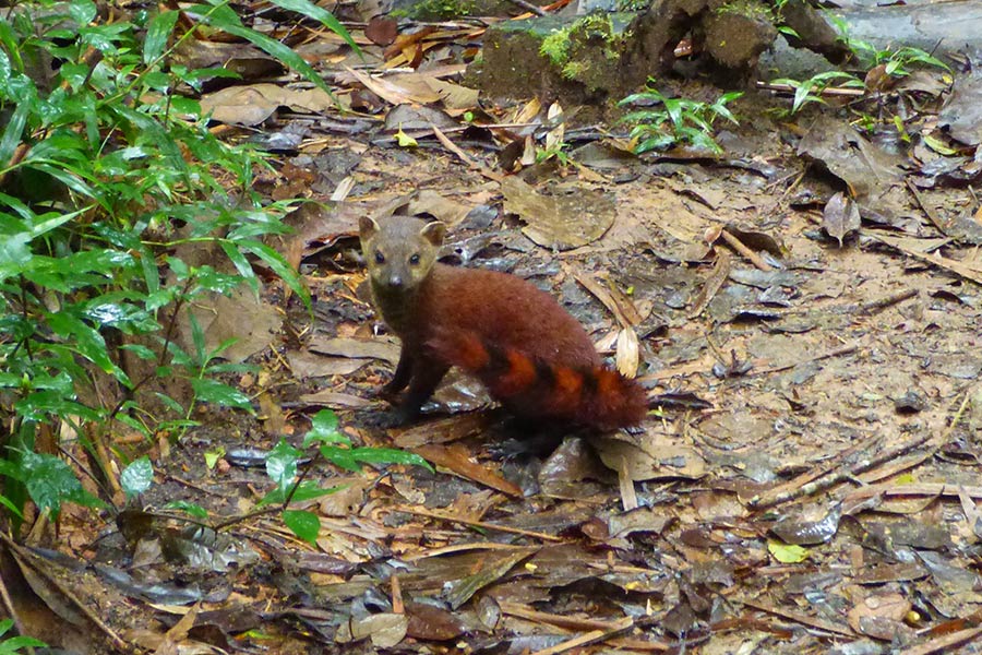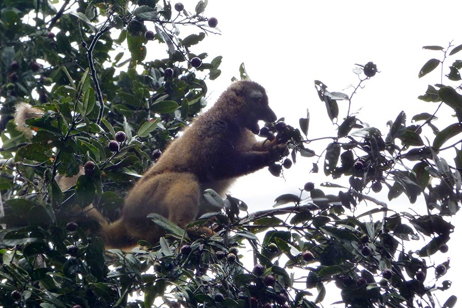 10 Uhr erreichten wir den Eingang zum Ranomafana-Nationalpark. Dort schlossen wir uns einem Guide an und wanderten bei leichtem Schauerwetter durch den Regenwald. Doch außer einigen Lemuren hoch in den Bäumen und einem Frosch hatten wir wenig Fotoglück. Unterwegs machten wir Picknick mit dem am Morgen gekauften Baguette und Streichkäse. Am Ende der Wanderung lief uns noch ein Mungo über den Weg und Brigitte zeigte uns auf einem entfernten Blatt einen Giraffenhalskäfer, den wir erst beim dritten Hinschauen entdeckten. Diese Tiere sind auf Madagaskar endemisch und die Hälse der Männchen erreichen eine doppelte bis dreifache Länge.
