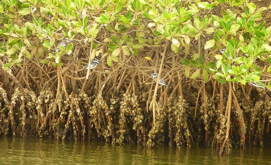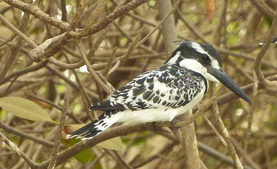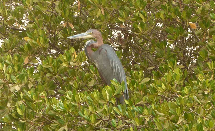 Nach dem Frühstück liefen wir gegen 9 Uhr die 50 Meter bis zum Fluss und kletterten in ein Boot. Die folgende Fahrt durch das Delta war interessant und zwischen den dichten Mangrovenbäumen konnten wir einige Eisvögel, Löffler, Pelikane und den großen Schieferreiher beobachten.