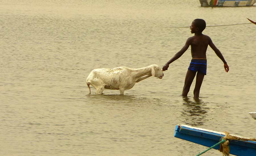 Gegen 12 Uhr fuhren wir mit dem Boot zurück und kauften uns in einem kleinen Laden kurz vor dem Hotel ein Baguette für 75 CFA, nachdem wir den auf der Kühltruhe Mittagsschlaf haltenden Besitzer aufgeschreckt hatten.