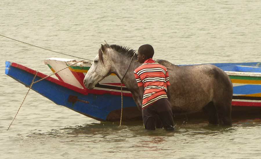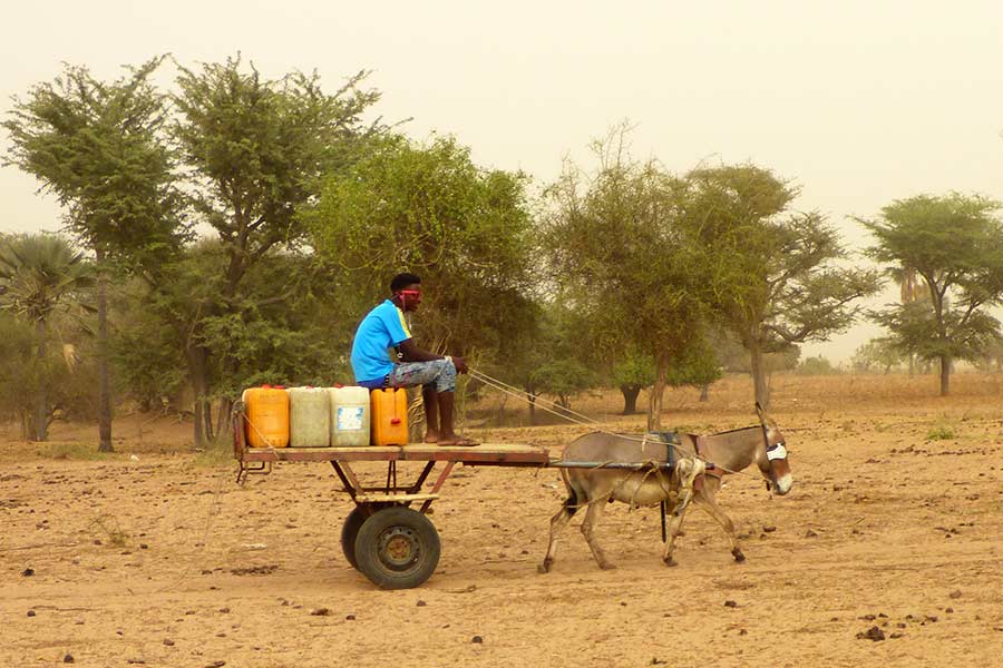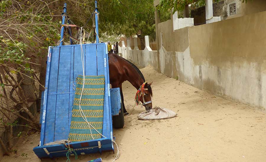 Für 17 Uhr hatte Mamadou eine Fahrt mit Pferdekutschen organisiert. Vor dem Hotel warteten dann auch zwei von den einachsigen Karren, die wir auf der bisherigen Fahrt oft gesehen hatten und mit denen auf dem Lande alles befördert wird. Sie dienen auch den Menschen als preiswertes Taxi.