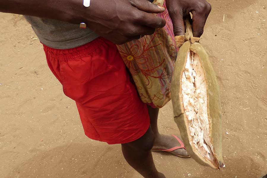 Beim anschließenden Spaziergang durch das saubere Dorf bekam Monika von einem freundlichen jungen Mann die aufgeplatzte Frucht eines Baobabs geschenkt.