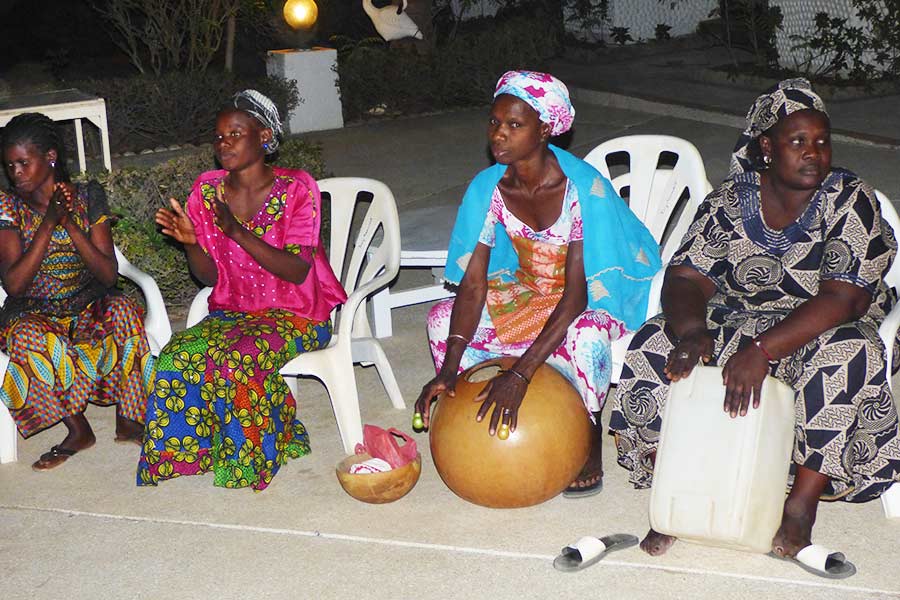 Man hatte auf uns gewartet und wir konnten die 45-minütige Vorführung, bei der auf großen Kalabassen getrommelt wurde und die Frauen drei Tänze vorführten, miterleben.