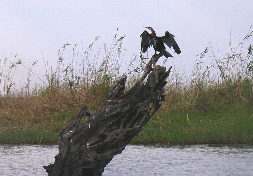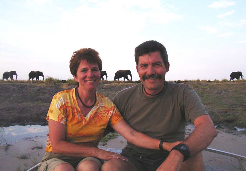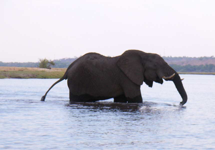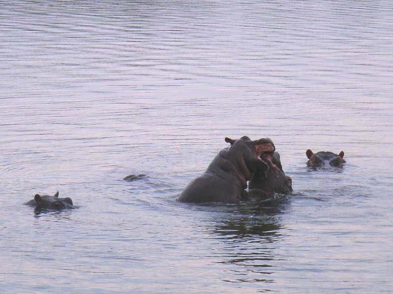 Die anschließende zweieinhalbstündige Bootsfahrt begann dann zunächst wieder sehr stürmisch und die sich am Bug brechenden Wellen spritzten weit ins offene Boot, in dem wir in mehreren Viererreihen auf Plastiksitzen dem Wetter zu trotzen versuchten. Aber zum Glück war das Unwetter nur von kurzer Dauer, so dass die weitere Flussfahrt noch sehr angenehm wurde und uns auch schnell wieder trocknete. Bis wir 18 Uhr wieder anlegten, sahen wir große Herden von Elefanten, die teilweise auch den Chobe durchquerten, schnaubende Hippos, Krokodile, Büffel, Giraffen, Antilopen und viele Wasservögel.