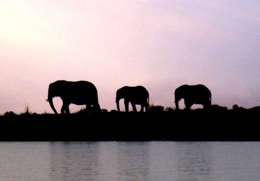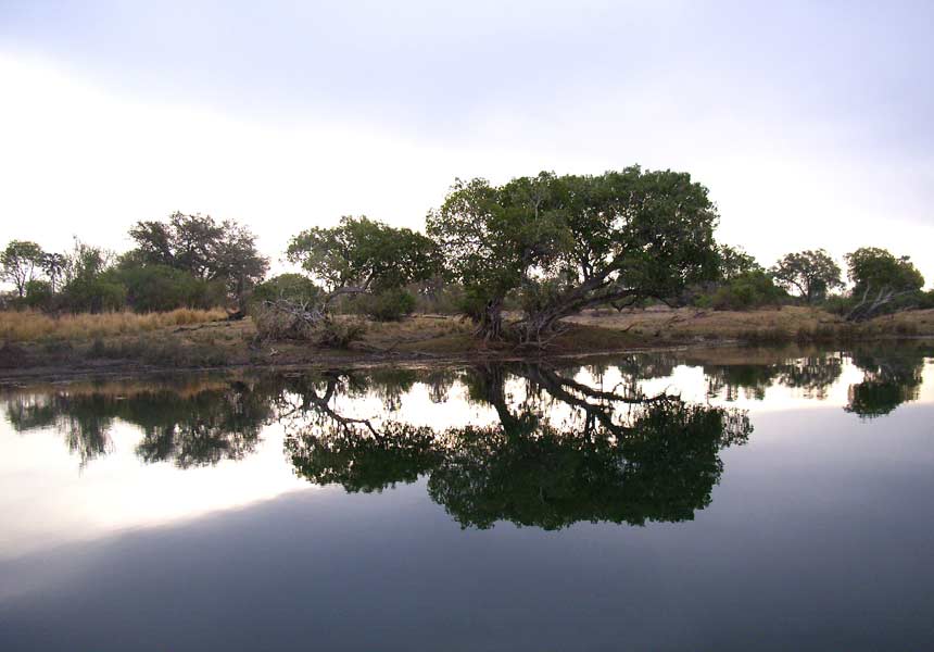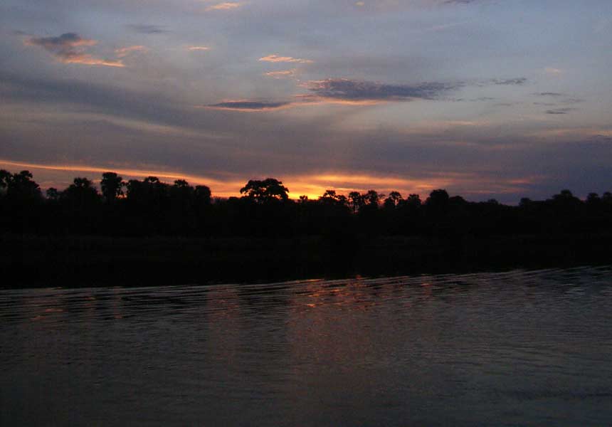 Insgesamt sollen in dieser Gegend etwa 73.000 Elefanten leben, die manchmal in Gruppen von bis zu 500 Tieren zur Tränke kommen. Sie richten dann allerdings auch viel Schaden an, so dass die Pflanzenwelt in der näheren Umgebung total verwüstet aussieht. Wir merkten nicht, wie die Zeit verging und mittlerweile wurde es langsam dunkel, die Bäume an den Ufern spiegelten sich in dem inzwischen spiegelglatten Fluss und wir erlebten einen wunderschönen Sonnenuntergang, bevor wir 18.30 Uhr anlegten und zurück ins Camp gefahren wurden.