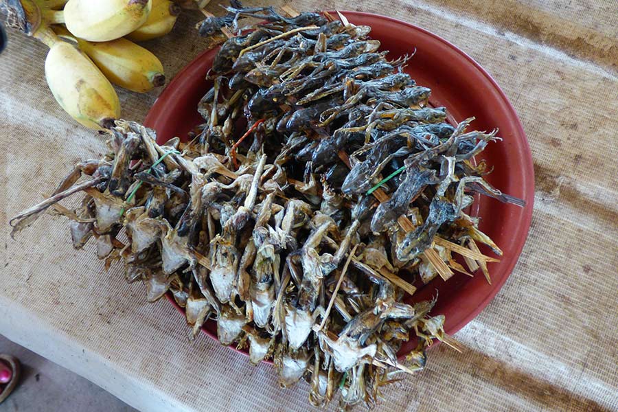 Nach dem Frühstück um 6.30 Uhr fuhren wir 7.30 Uhr zunächst tanken und danach machten wir wieder einmal einen interessanten Marktbesuch. Dort gab es alles, was das Herz einer laotischen Gourmetköchin höher schlagen lässt; lebende Löwenschlangen, Heuschrecken, gegrillte Maden in allen Größen und Frösche waren die absoluten „Leckerbissen“.