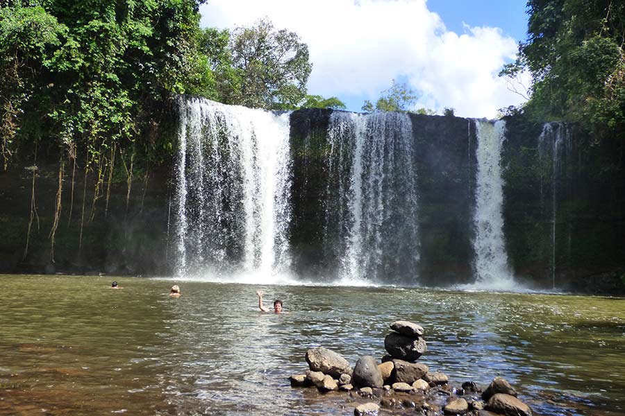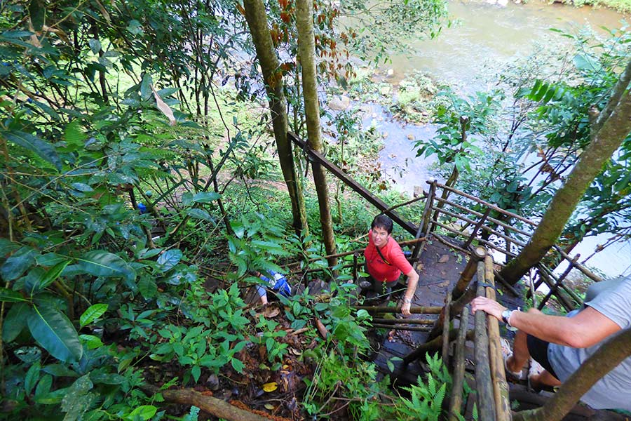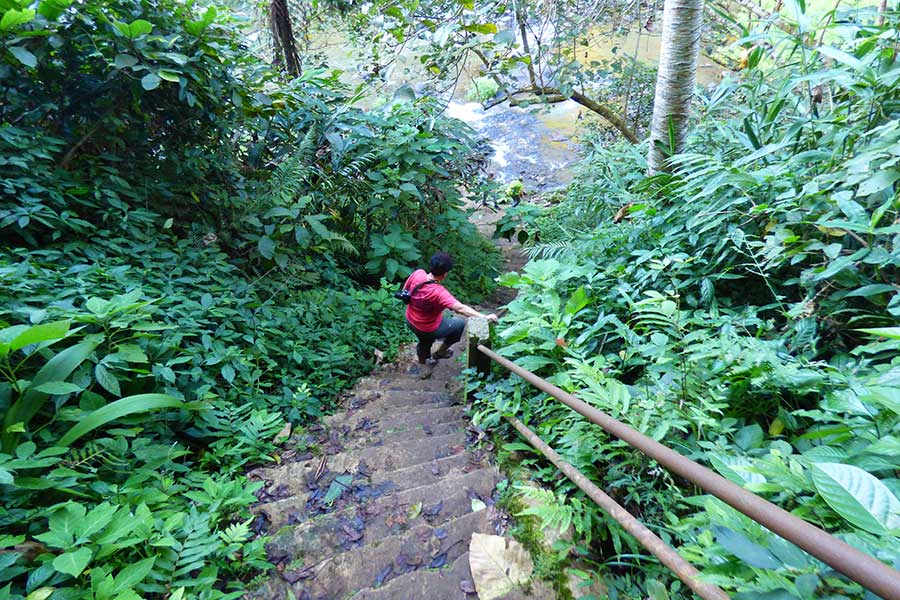 Eine willkommene Erfrischung nach dem doch etwas Schweiß treibenden Marsch war ein kühles Bad im „Thamchampy“-Wasserfall, der über eine steile Holztreppe und über schmale Laufbretter zu erreichen war.