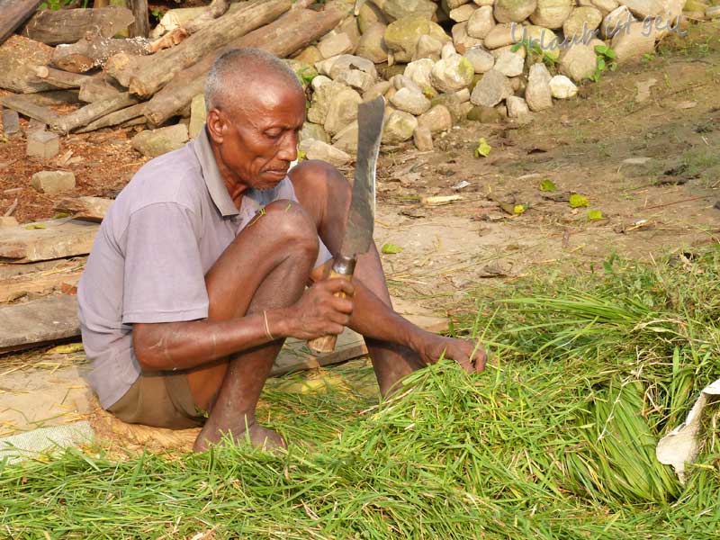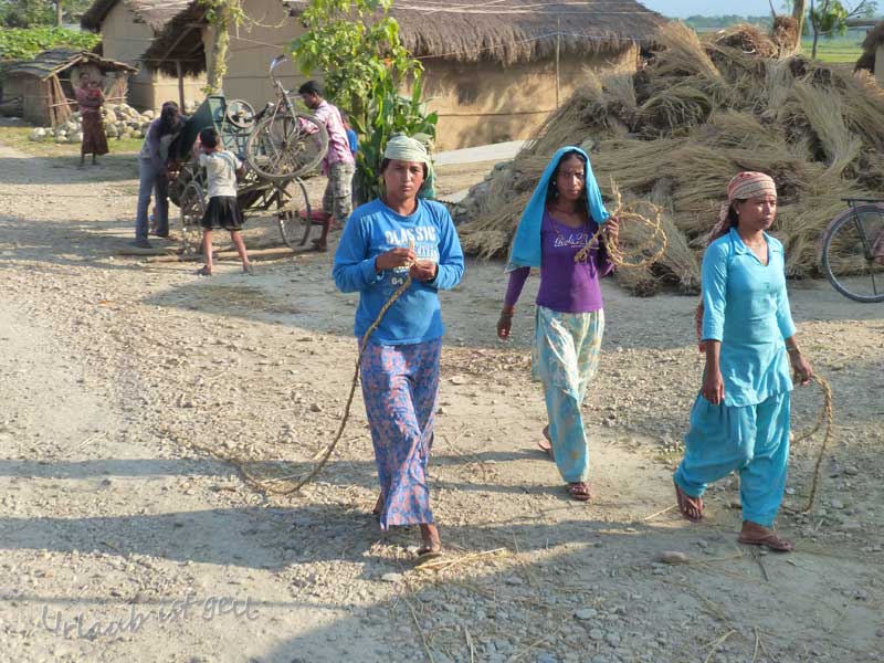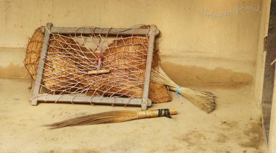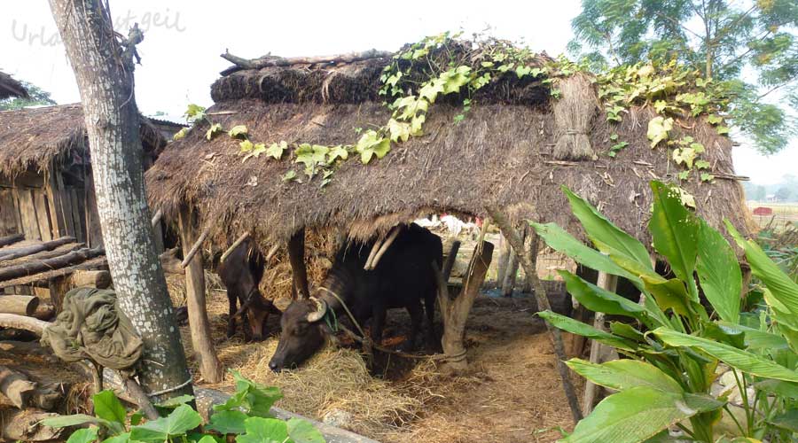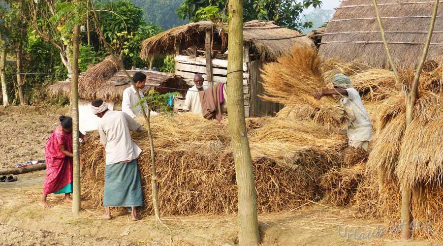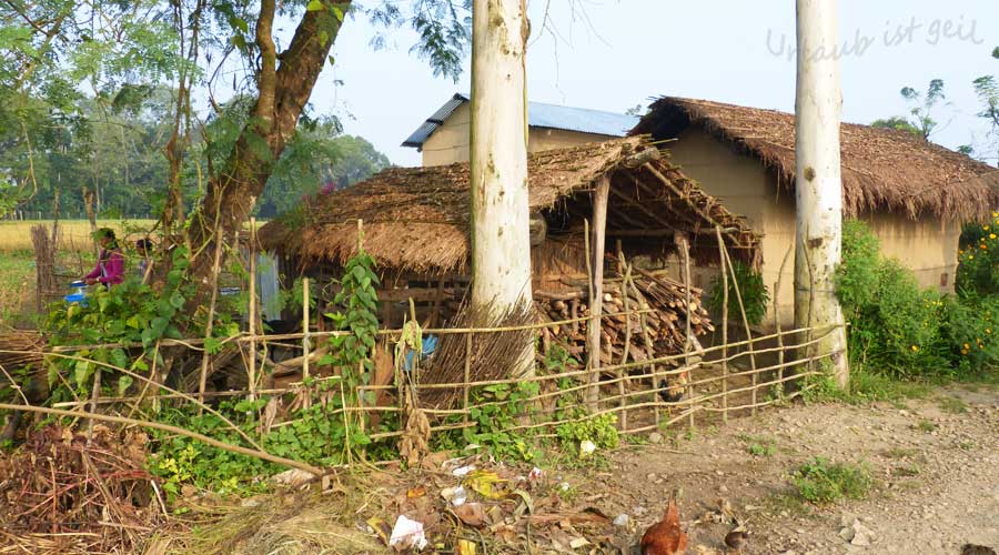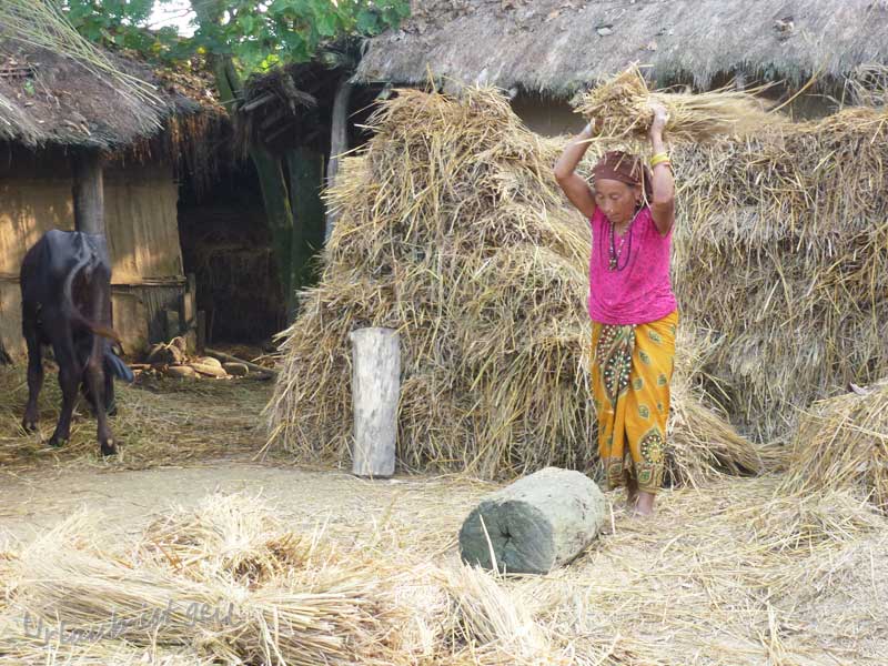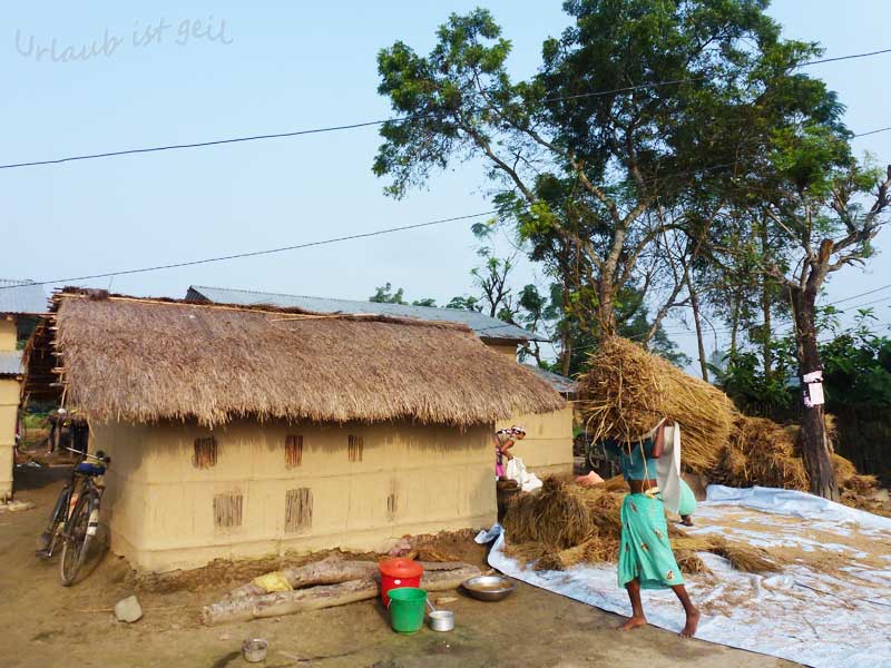 Unser Resort befand etwas abseits des kleinen Ortes Sauraha, der durch den Fluss Rapti vom Nationalpark getrennt ist. Nach wenigen Gehminuten erreicht man ein Dorf, in denen die Tharus leben. Die Menschen versorgen sich weitgehend mit allen Dingen selbst und bewohnen traditionelle Lehmhäuser ohne Fenster. Um Insekten fernzuhalten gibt es nur mit Strohhalmen verschlossene Luftöffnungen Damit das ehemalige dörfliche Leben erhalten bleibt (und natürlich den Touristen zu zeigen), bekommen die Bewohner Unterstützung vom Staat. Trotz des kleinen touristischen Touchs war es sehr interessant und identisch.