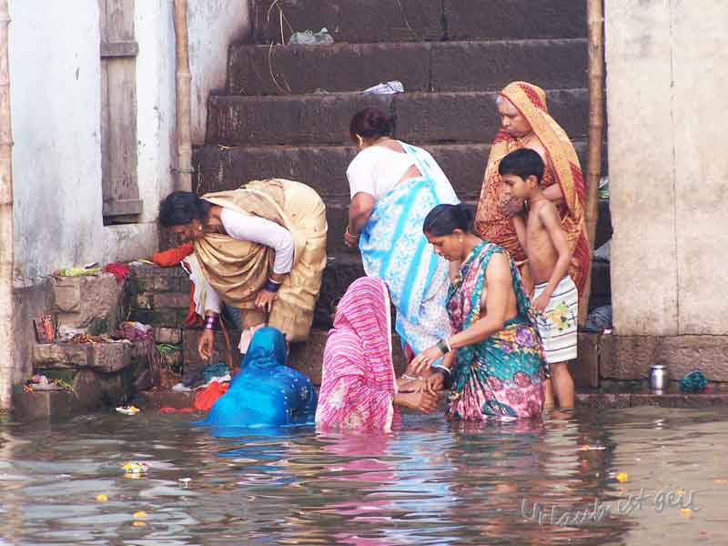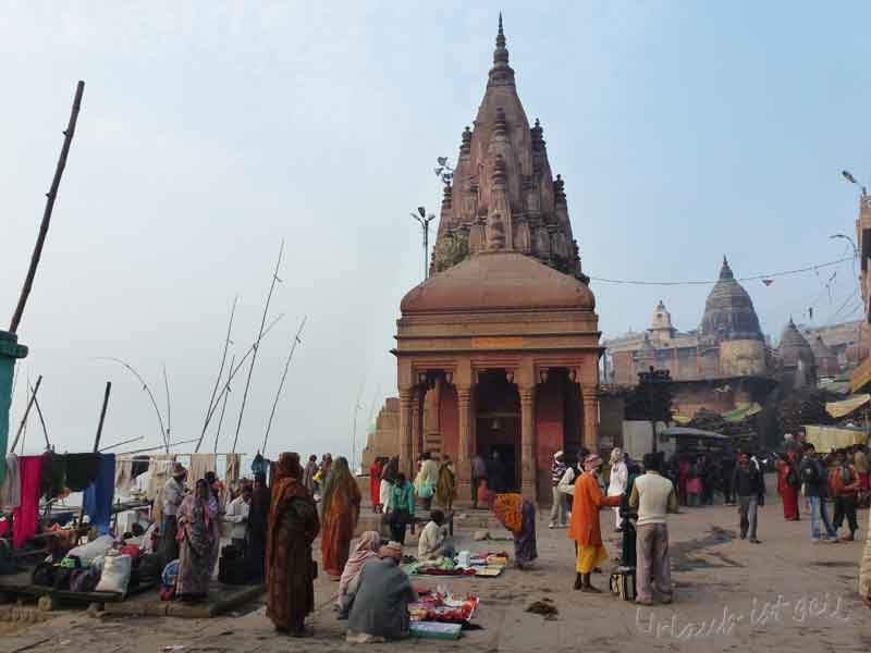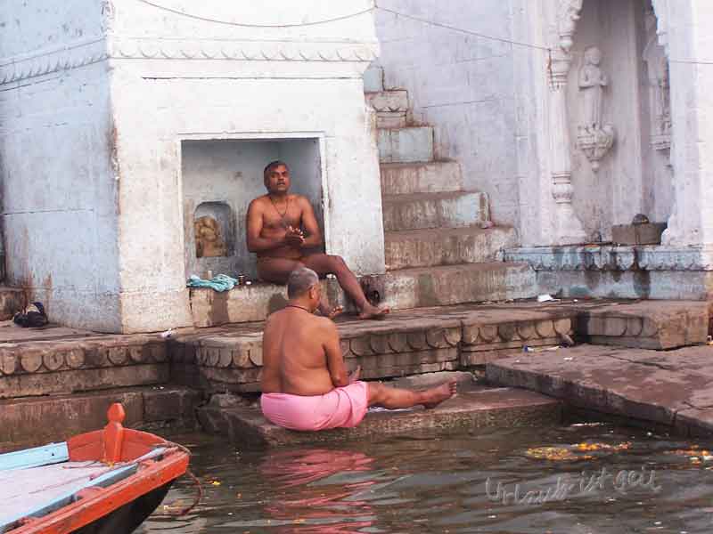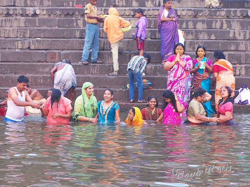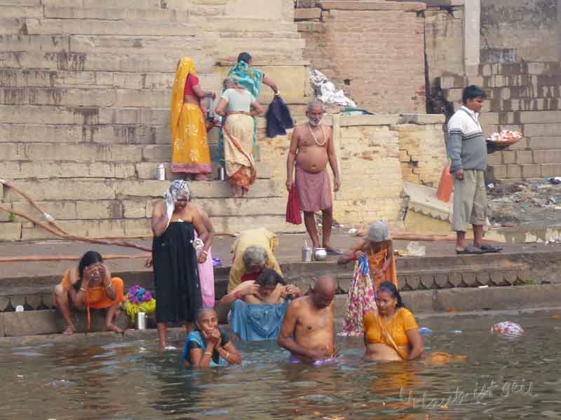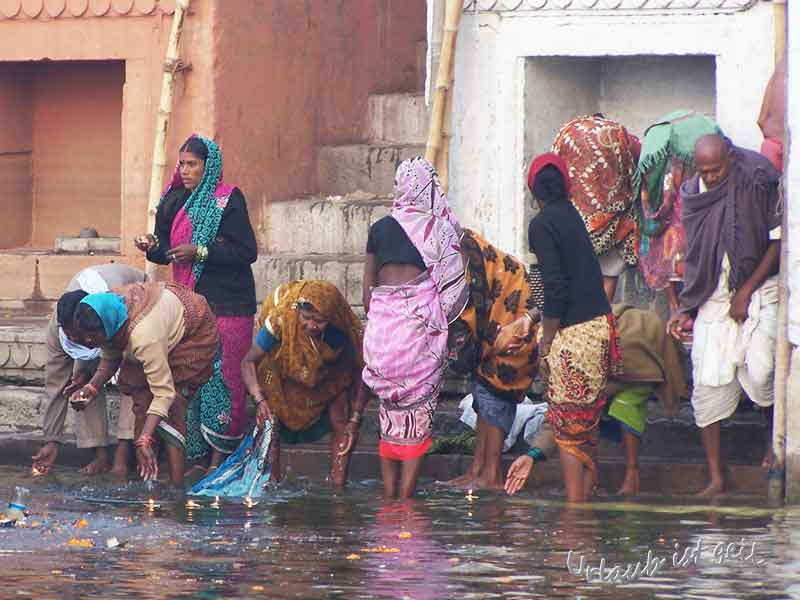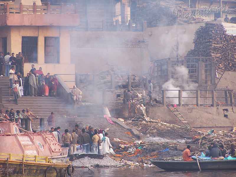 Am Ufer des Ganges befinden sich die stufenförmigen Ghats. Auf ihnen baden die Gläubigen im Wasser des heiligen Flusses um sich von Sünden zu reinigen. Daneben werden die Verstorbenen verbrannt und deren Asche in den Fluss gestreut. In Varanasi zu sterben und verbrannt zu werden, bedeutet den Ausbruch aus dem ständigen Kreislauf der Wiedergeburt.