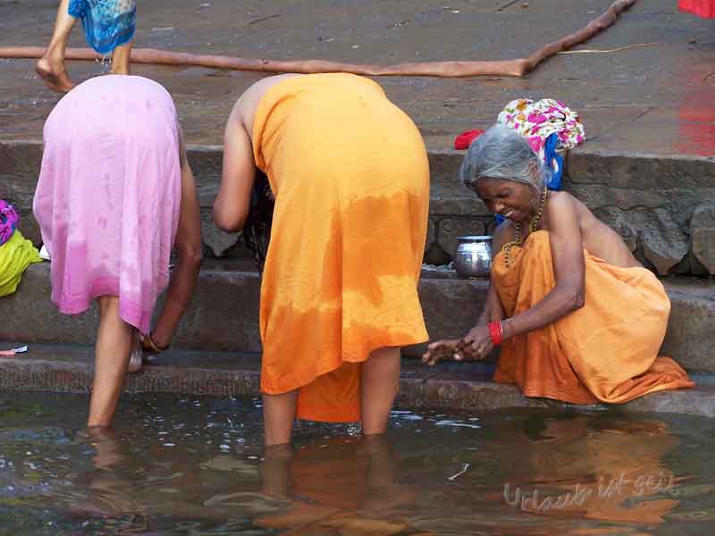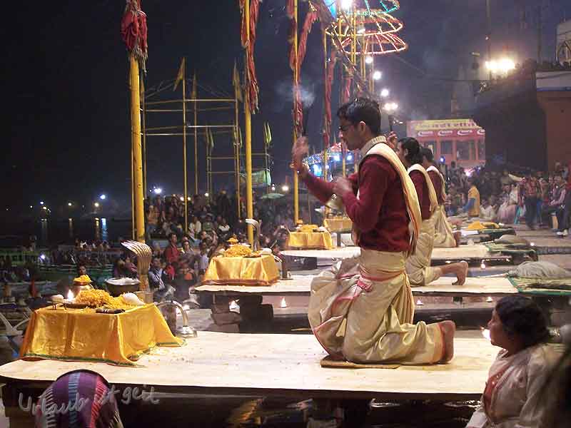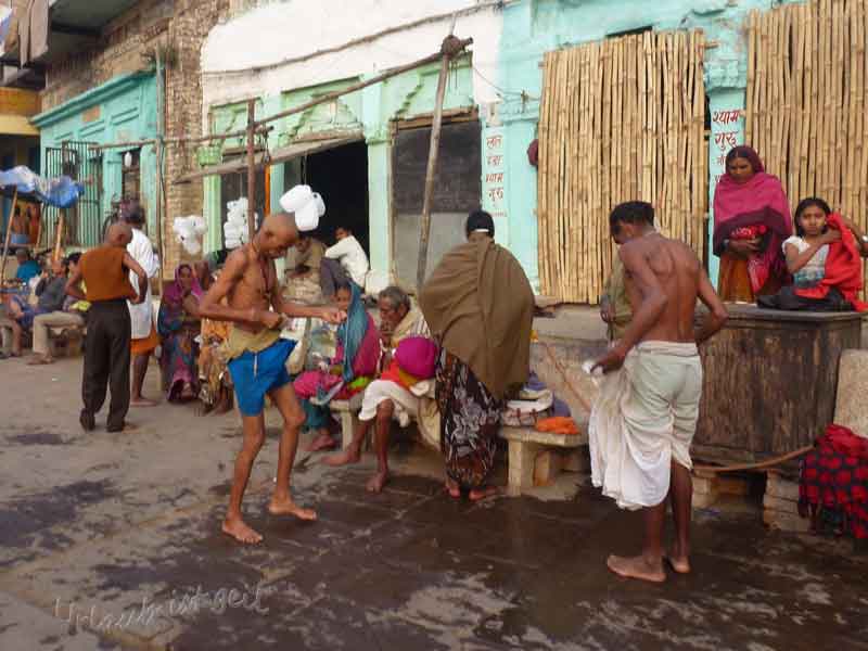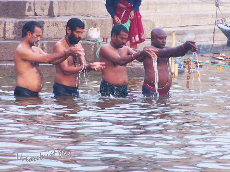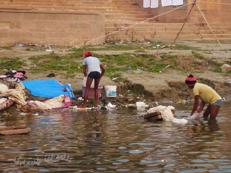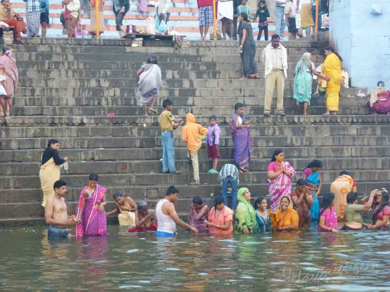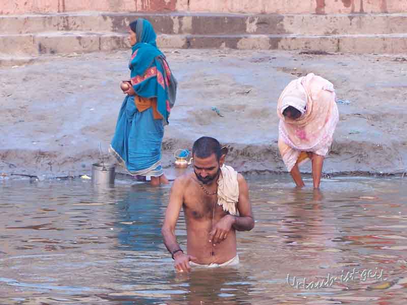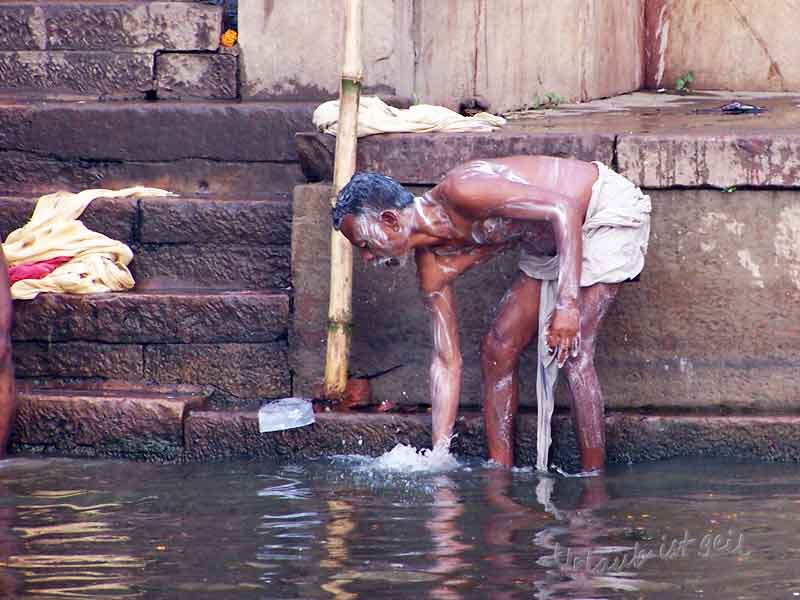 Am Ufer des Ganges befinden sich die stufenförmigen Ghats. Auf ihnen baden die Gläubigen im Wasser des heiligen Flusses um sich von Sünden zu reinigen. Daneben werden die Verstorbenen verbrannt und deren Asche in den Fluss gestreut. In Varanasi zu sterben und verbrannt zu werden, bedeutet den Ausbruch aus dem ständigen Kreislauf der Wiedergeburt.