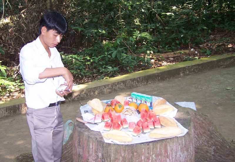 Am Fuße des Baumes bereitete uns Dsching ein schönes Lunch aus den unterwegs von ihm gekauften Sandwichs, Schweinefleisch, Käse und Melone, welches wir uns in der freien Natur nach der doch etwas anstrengenden Wanderung schmecken ließen.