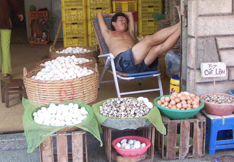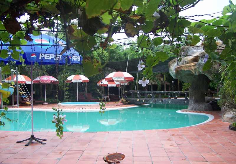 Nachmittags paddelten wir einige Zeit in Autoschläuchen im Pool umher, als es das erste Mal im Urlaub für eine halbe Stunde leicht zu nieseln anfing. Harry kaufte eine kleine Flasche Reisschnaps für 20.000 Dong, die wir unter den laubbewachsenen Sitzplätzen an der Seite des Pools leerten, während die Musiker wieder anfingen, mit großer Ausdauer und Begeisterung ihre eintönigen Lieder zu singen und spielen.