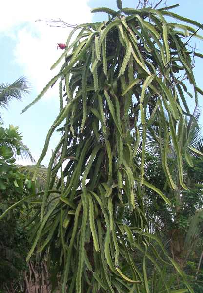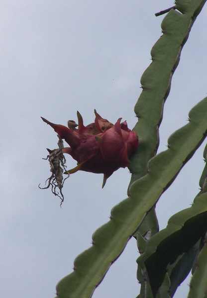 Nachdem wir unsere Vorsuppe, die Reisnudeln mit Schweinefleisch und das Obst gegessen hatten, sahen wir gleich neben unserem Platz zum ersten Mal eine Drachenfrucht am Baum wachsen.