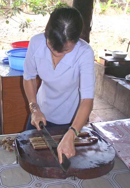 Danach stiegen wir in kleinere Acht-Personen-Boote um, die uns zur Coconut-Candy-Manufactur fuhren. Dort wurde uns demonstriert, wir aus eingedicktem Kokossirup ein Teig geknetet und nach dem Ausrollen in Streifen geschnitten wurde.