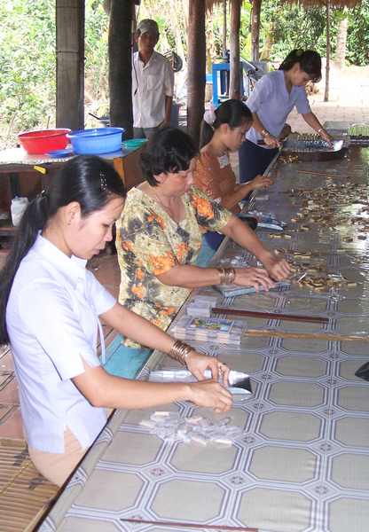 Nach dem Zerteilen in kleine Stücke wurden diese von drei Frauen in Papier eingewickelt und danach verpackt. Das alles geschah ohne eine einzige Maschine nur mit den Händen.