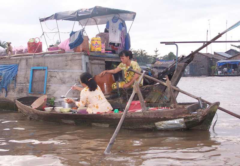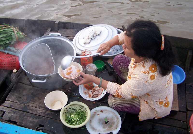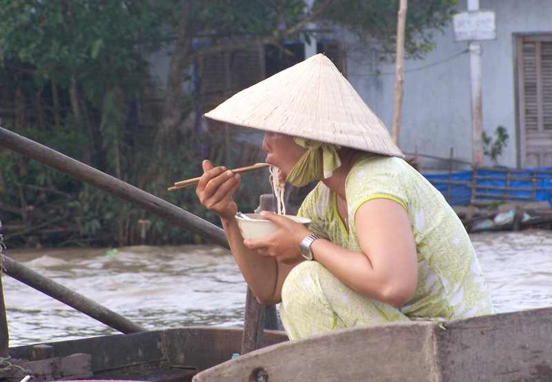 Da wir abgesprochen hatten, das im Bungalowpreis inklusive Frühstück auf dem Markt zu essen, winkte unserer Führer das Versorgungsboot heran, in welchem eine Frau Nudelsuppe aus einem großer Topf und andere Speisen anbot. Das Boot legte längsseits an und wir kauften drei Nudelsuppen zu je 3.000 Dong. Der Bootsführer kaufte uns drei Baguettes und eine Ananas, die er uns gleich schälte.