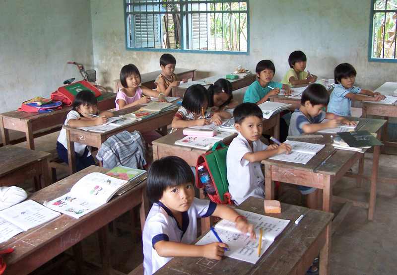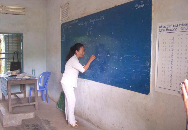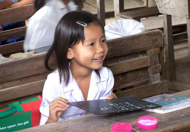 Später ließen wir uns an einer Grundschule an Land setzen, wo gerade Rechnen geübt wurde und die Kinder die Aufgaben und Lösungen mit Kreidestift auf Schiefertafeln schrieben, welche sie auf einen Linealschlag der Lehrerin auf das Pult hin schnell hochhielten.