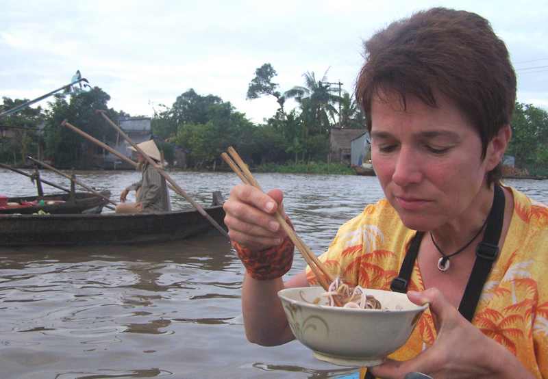 So hatten wir noch nie gefrühstückt – rings um uns kurvten große und kleine Boote umher und mittendrin saßen oder besser hockten (denn die Lehnen der Sitze waren defekt) wir und aßen mit unseren Stäbchen Nudelsuppe.
