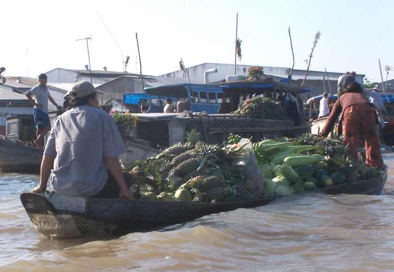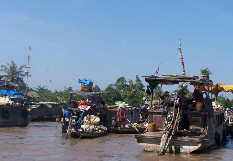 Eine halbe Stunde nach dem inklusiven Sieben-Uhr-Frühstück fuhr uns der Bus eine Viertelstunde bis zu den Booten, wo sich die 20 Personen auf zwei Boote verteilten und zum Cai Rang Markt fuhren, wo aber um diese Zeit nicht mehr allzu viel los war.