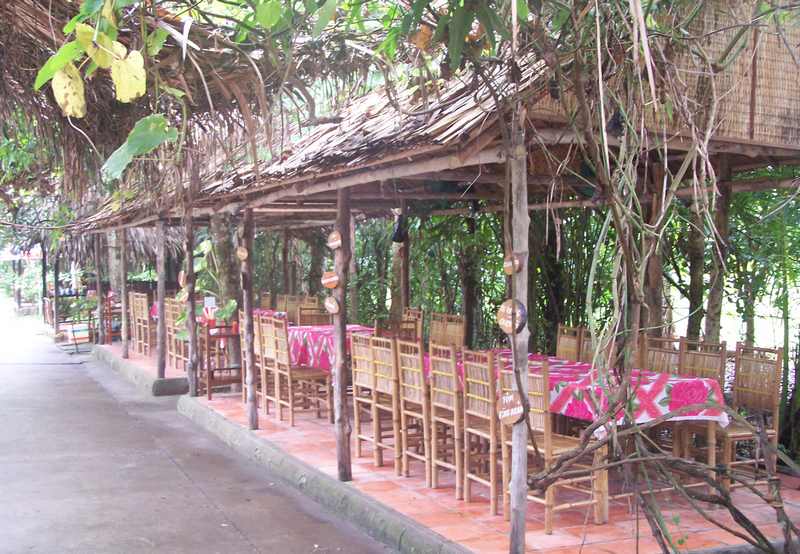 Gegen 14.00 Uhr entschlossen wir uns, etwas zu essen – Monika bestellte sich eine typische Spezialität des Mekongdeltas – einen Elefantenohrfisch.Da wir keine Karte hatten und der Kellner kein Englisch verstand, musste sie ihre pantomimischen Talente anwenden, um verständlich zu machen, was sie wollte. Umso größer war die Überraschung, als dann wirklich das Gewünschte gebracht wurde. Wir anderen aßen Nudelsuppe mit Reispapier, in das frische Kräuter eingewickelt wurden.