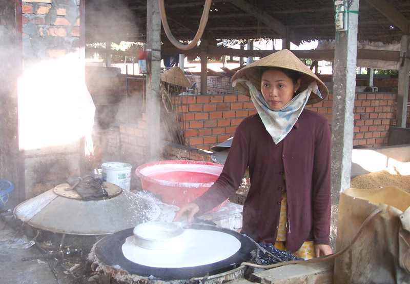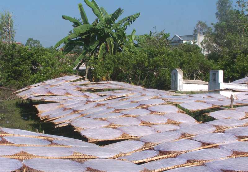 Unterwegs machten wir noch einem kurzen Stop zur Besichtigung einer Reisnudelfabrik, wo vier Beschäftigte in ausschließlicher Handarbeit mit der Herstellung von runden Reisteigfladen beschäftigt waren, welche dann auf geflochtenen Matten in der Sonne getrocknet wurden.