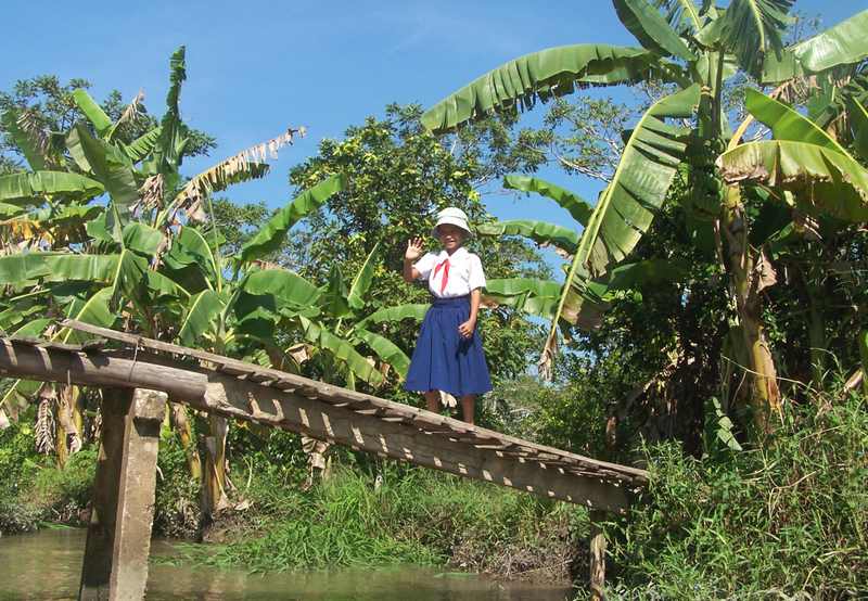 In einem kleinen Laden nebenan kauften wir dann einige Packungen Kekse (das Angebot war nicht sehr groß) und gaben sie, zur Freude der Kinder, der Lehrerin. Danach überquerten wir vier nacheinander eine schmale Monkeybridge; danach auch unser Bootsführer – dieser allerdings freihändig und zehnmal so schnell wie wir.
