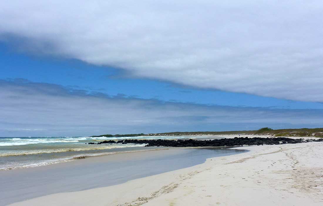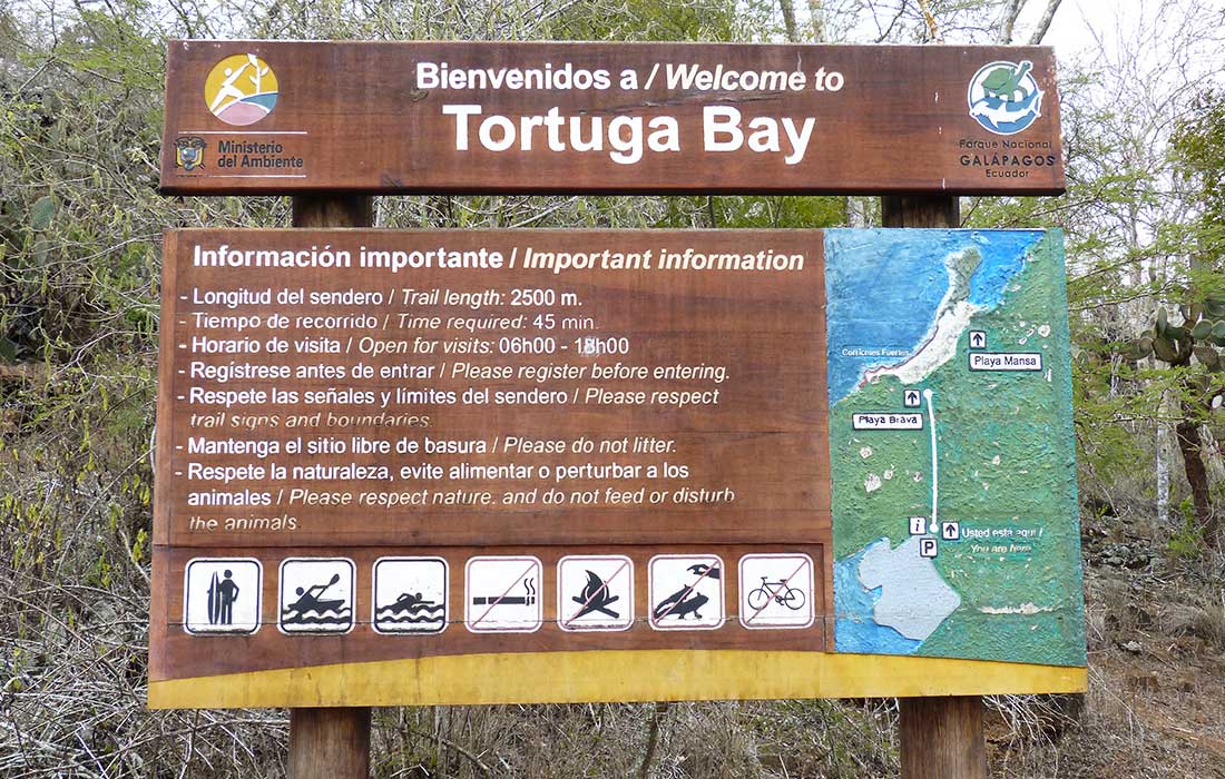 Für den heutigen Urlaubstag war kein Programm vorgesehen und wir zwei beschlossen zusammen mit Marlies und Ralf zur Tortuga Bay zu wandern. Wir packten die Badesachen und marschierten zum Parkplatz, von dem ein 2,5 Kilometer langer gepflasterter Weg zur Bucht führt. Kurz nach dem Parkplatz gelangten wir an den Eingang, hier muss sich jeder in einem Buch registrieren. Nach einer guten halben Stunde vorbei an hohen Kakteen lag der feinsandige breite Strand der Tortuga Bay vor uns. Der Himmel riss langsam auf und bald würde sich die Sonne zeigen. Nur Schatten war hier aus Mangel an Bäumen leider nirgendwo zu finden.