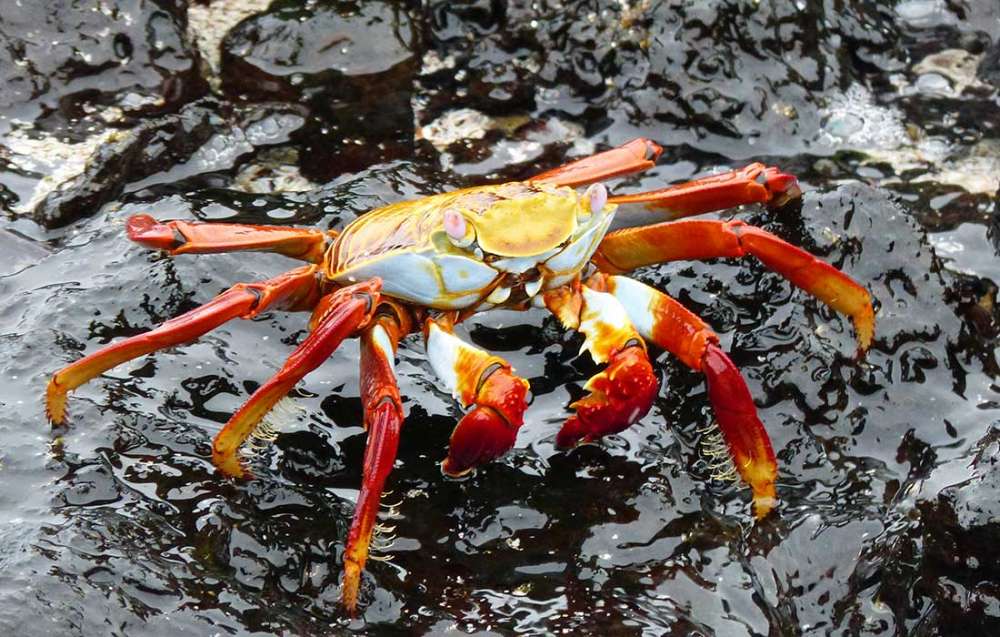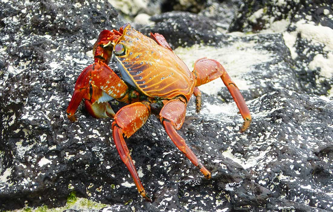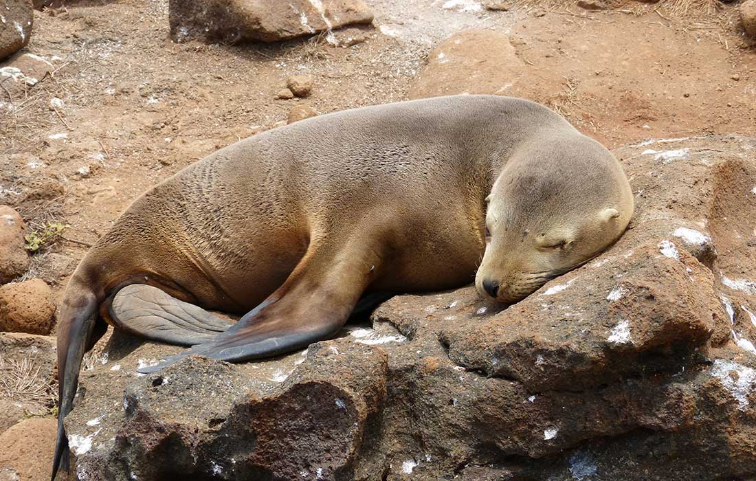 Auf der Insel angekommen, bekamen die blassen Gesichter wieder etwas Farbe und wir konnten eine einstündige leichte Wanderung unternehmen, auf welcher uns viele possierliche Robben, Seelöwen und Echsen begegneten. Auch die Krabben auf den Felsen am Meer waren sehr hübsch. Leider war der Himmel heute bedeckt und die Sonne ließ sich nicht blicken.