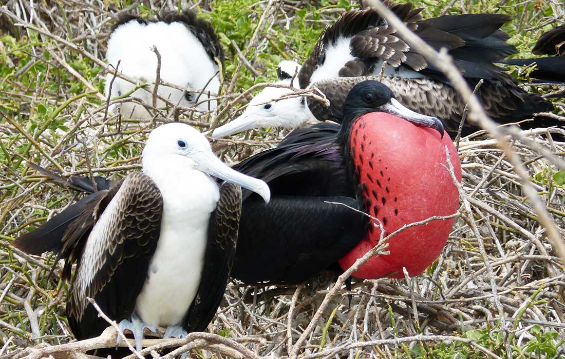 Anschließend gab es auf dem Boot ein gutes Mittagessen und wir schipperten weiter bis zur Insel Nordseymour. Uns erwartete dort einer der Höhepunkte der Reise. Kaum hatten wir das steile Ufer erklommen entdeckten wir neben Robben und Echsen große Kolonien von beeindruckenden Prachtfregattvögeln bei der Balz.
