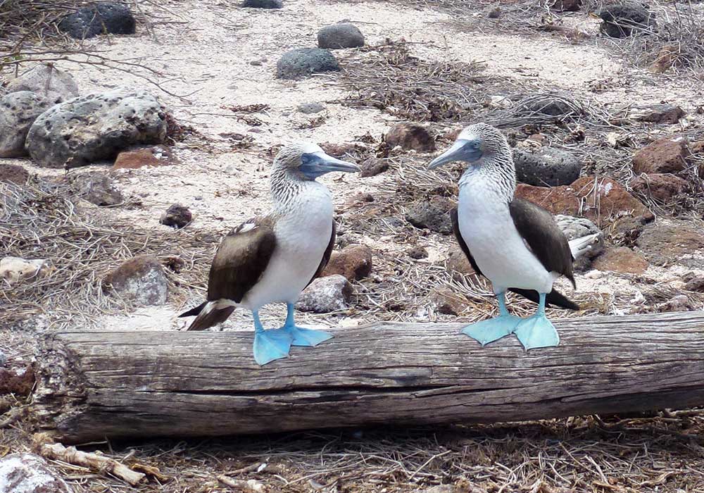 Am Ende der kleinen Wanderung durch das Vogelschutzgebiet erblickten wir eine kleine Kolonie von lustig aussehenden Blaufußtölpeln. Mit ihren herrlich blauen Füßen, die ihnen ihren treffenden Namen geben, liefen sie - etwas ungeschickt wirkend - auf einem Baumstamm hin und her.