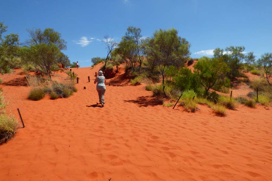 Am nächsten Stopp konnten wir aus der Ferne den 300 Meter hohen Mount Connor erblicken. Er liegt 100 km östlich des Uluru und ist 2,8 km lang. Als wir für einige Fotos ausstiegen hatte die Erde diese tiefrote Farbe, die man von Postkarten kennt und die dem Roten Zentrum seinen Namen gibt.
