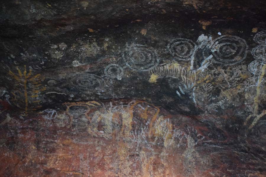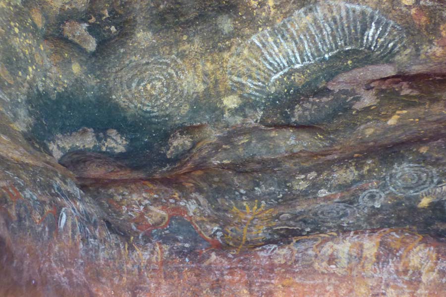 Hier waren wir wieder froh, Fliegennetze zu haben, denn die die kleinen Biester waren wieder besonders lästig. Wir wanderten bis zum Mutitjulu-Wasserloch und sahen einige Felsmalereien. Nach jeder Biegung ergaben sich neue wunderschöne Motive des aus der Nähe gar nicht mehr so glatt aussehenden Berges und die tiefstehende Sonne gab dem Gestein schöne Rottöne.