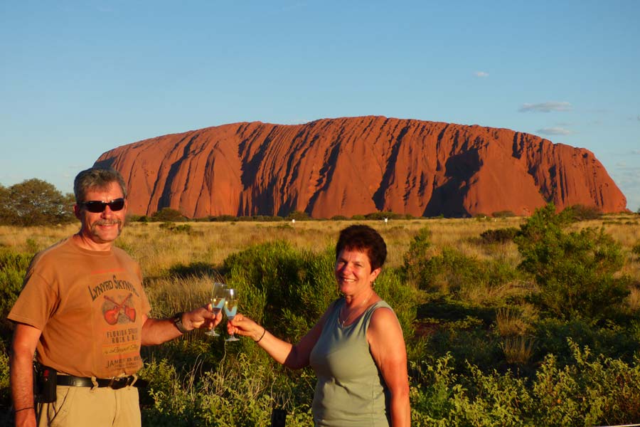 Anschließend fuhren wir zu einem Parkplatz, von dem wir den spektakulären Sonnenuntergang am Uluru mit einem (leider warmen) Glas Sekt beobachten konnten. Nach dem Schauspiel fuhren wir zurück zum Camp. Hier gab es einen guten Sanitärtrakt mit sehr sauberen Duschen und Toiletten. Jane stellte uns verschiedene Zutaten für das Abendessen auf den Tisch und wir "durften" uns das Essen selbst zubereiten. Es gab Nudeln mit Hühnchen und Gemüse auf asiatische Art und war den Köchen gut gelungen.