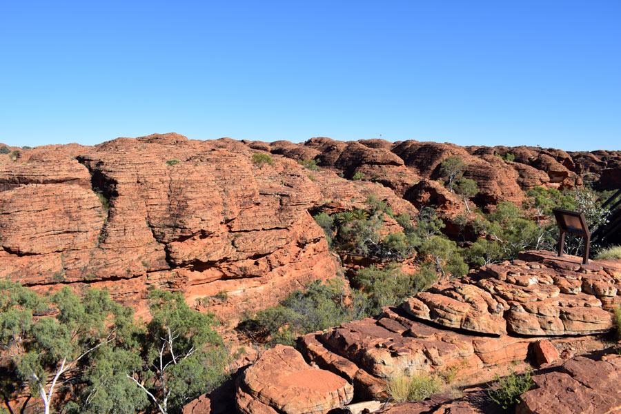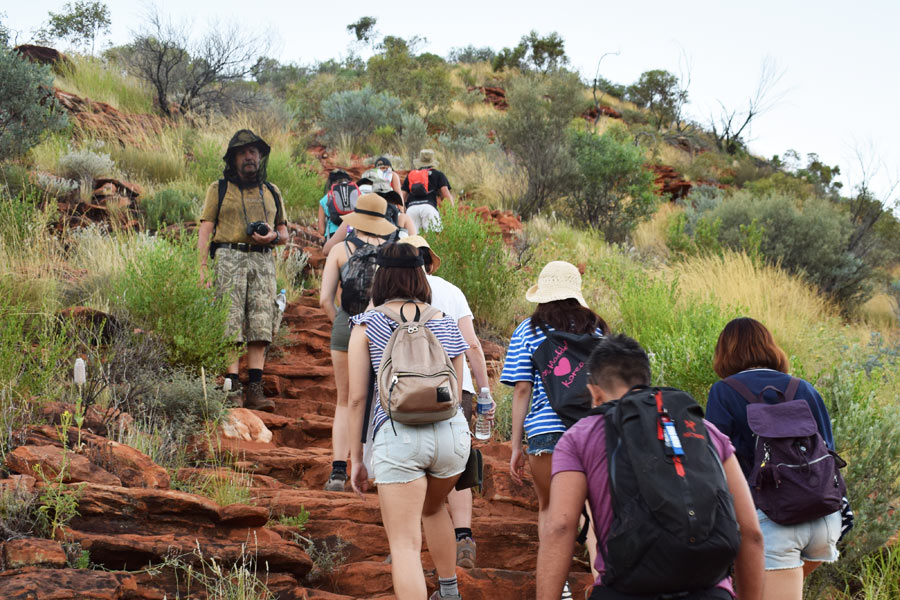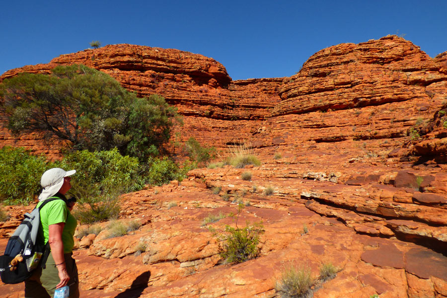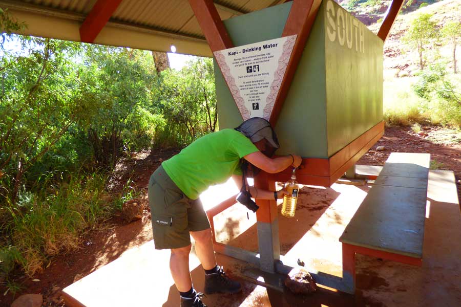 Am Kings Canyon angekommen, wurden wir von Jane ausführlich belehrt, wie wir uns auf der bevorstehenden 6 Km langen Wanderung entlang des Kings Canyon Rim Walk am Randes des Kings Canyon verhalten sollten und was wir beachten müssen. Natürlich war ausreichend Wasser wieder besonders wichtig, denn erstens wurde es heute richtig heiß und zweitens gab es diesmal keine Gelegenheit, Wasser nachzufüllen.