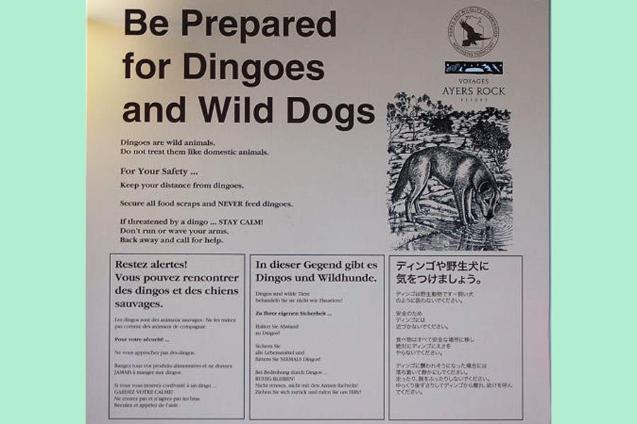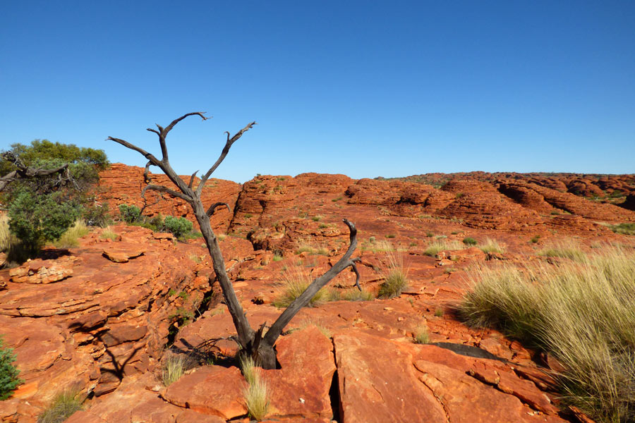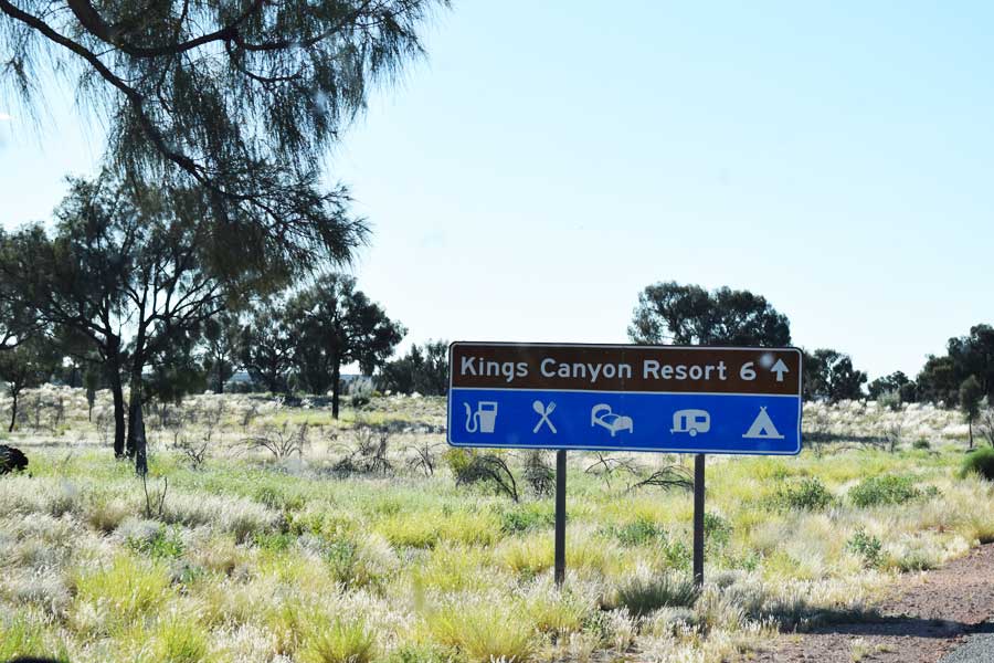 Wir hatten gut geschlafen in unserem Zelt. Monika erzählte mir, dass sie nachts mit der Taschenlampe bewaffnet auf der ca. 100 Meter weit entfernten Toiletten war und sie auf dem Weg plötzlich zwei leuchtende Augen ansahen. Der Dingo, der zu den Augen gehörte, verzog sich aber dann zum Glück in die Büsche. Direkt in unserem Camp war in der Nacht auch ein Dingo gewesen. Ich war vom lauten Geheul erwacht, die Leute in den Swags natürlich auch. Der Essensgeruch hatte ihn angelockt. Als wir nach dem Frühstück um 6.30 Uhr zum Kings Canyon abfuhren, bekam unser Camp auch wieder Besuch von einem Wildhund.