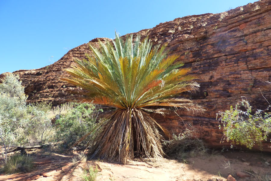 Unterwegs wechselte die karge Landschaft plötzlich in eine üppig mit Palmen und anderen Gewächsen durchzogenen Schlucht, den sogenannten Garten Eden. Der Kings Creek fließt, wenn auch sehr spärlich durch die Schlucht und am Ende hat sich ein Wasserloch gebildet. Dort machten wir für eine halbe Stunde Rast.