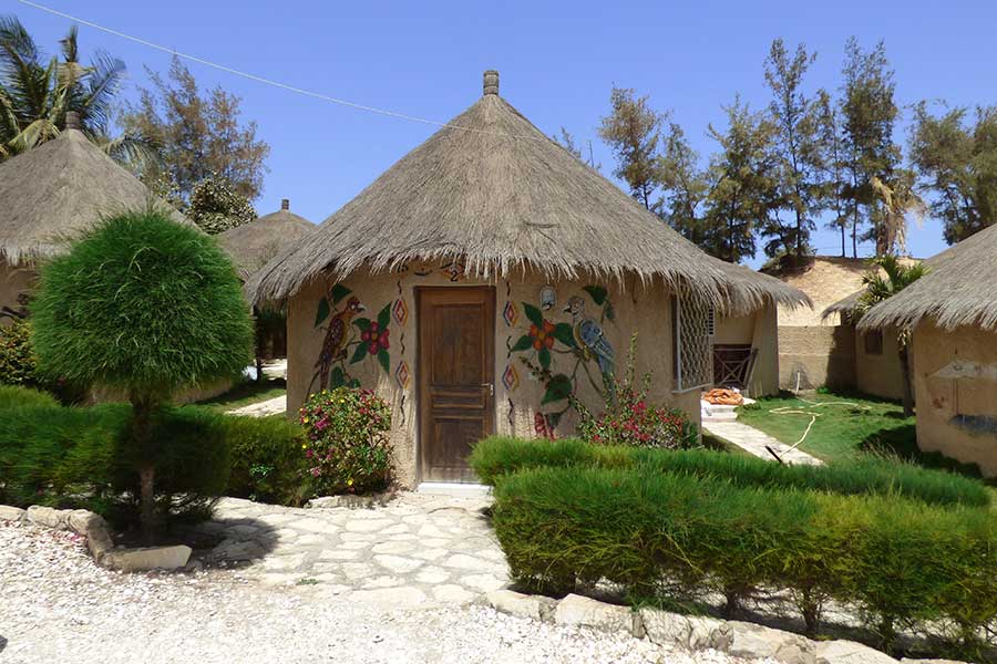 Mittags wurden wir im von Dünen umgebenen Hotel "Chez Salim" mit Baobab- und Hibiscussaft begrüßt und bezogen nach einem schnellen Check-in unsere Hütten. Gleich danach trafen wir uns im Hotel-Restaurant zum Essen. Monika und ich entschieden uns für das Buffet für je 10.000 CFA. Es gab leckeren Fisch, Hähnchen, Beefsteak, Beefgulasch und als Nachspeise Pudding und Kuchen.