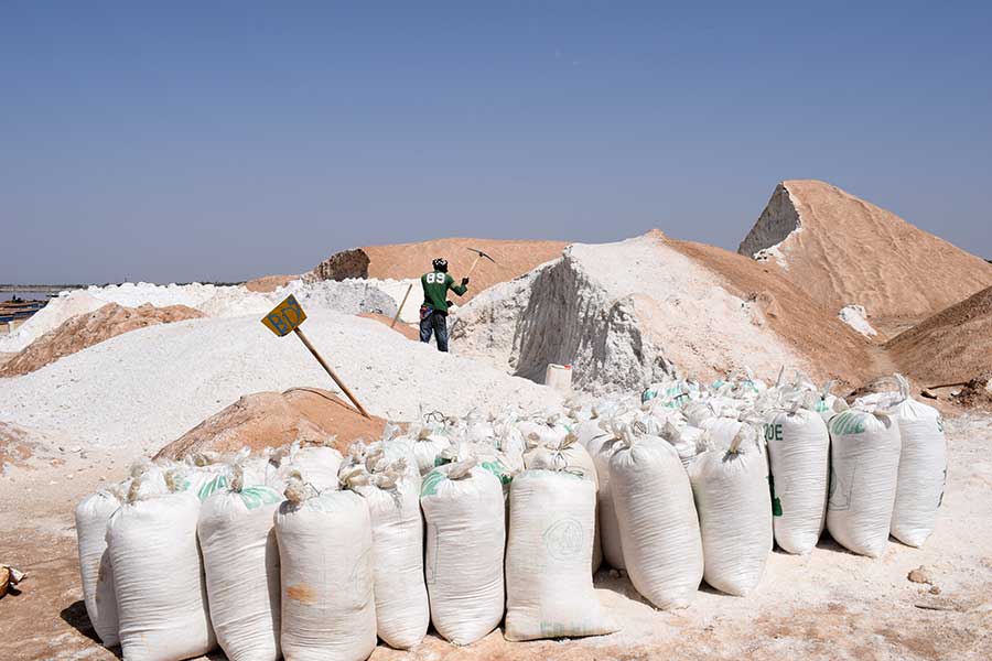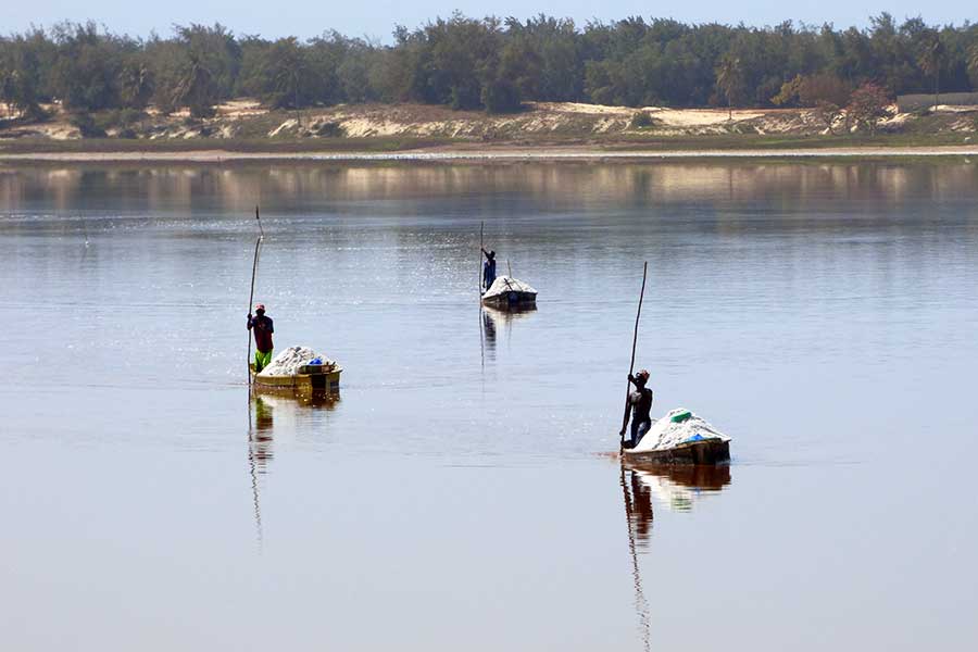 Das Salz wird von den Salzbauern auf dem Grunde des flachen Sees "geerntet", mühsam in die Boote geladen und nach einer wackligen Fahrt über den See in große Schüsseln geschaufelt. Diese zentnerschwere Last wird dann von Frauen auf dem Kopf zu den Halden getragen. Wenn das Salz nach Tagen getrocknet ist, wird es von den inzwischen steinhart gewordenen Halden abgehackt und in Säcke gefüllt.