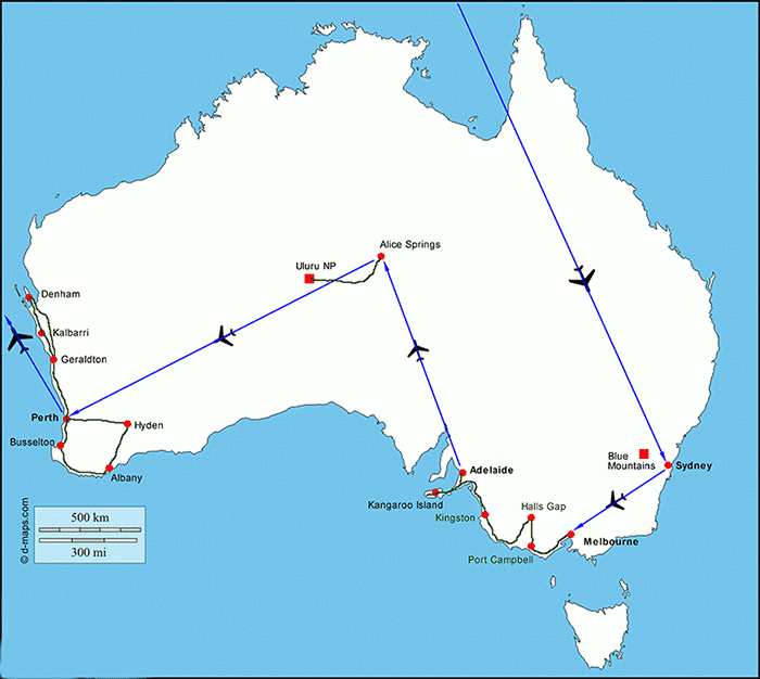 Sydney, Blue Mountains, Melbourne, Great Ocean Road, Kangaroo Island, Adelaide, Uluru, Olgas, Kings Canyon, Wave Rock, Pinnacles, Kalbarri NP, Valley of the Giants, Elephant Rocks, Delphine in Monkey Mia.