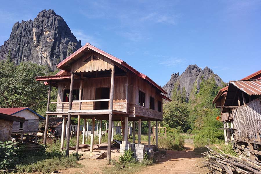 Einen weiteren Stopp legten wir kurz vor 12 Uhr an der „Laotischen Mauer“ ein. Im Dorf Ban Na Gna Vai, kurz vor dem Ort Thakhek, sahen wir ein gut erhaltenes Teilstück davon. Es handelt sich um die Felsformation „Kampaeng Yak“, die einer künstlich erbauter Mauer ähnelt. Eine Sage erzählt, dass sie von Riesen erbaut worden sein soll, den gleichen, die auch in der Ebene der Tonkrüge tätig waren.